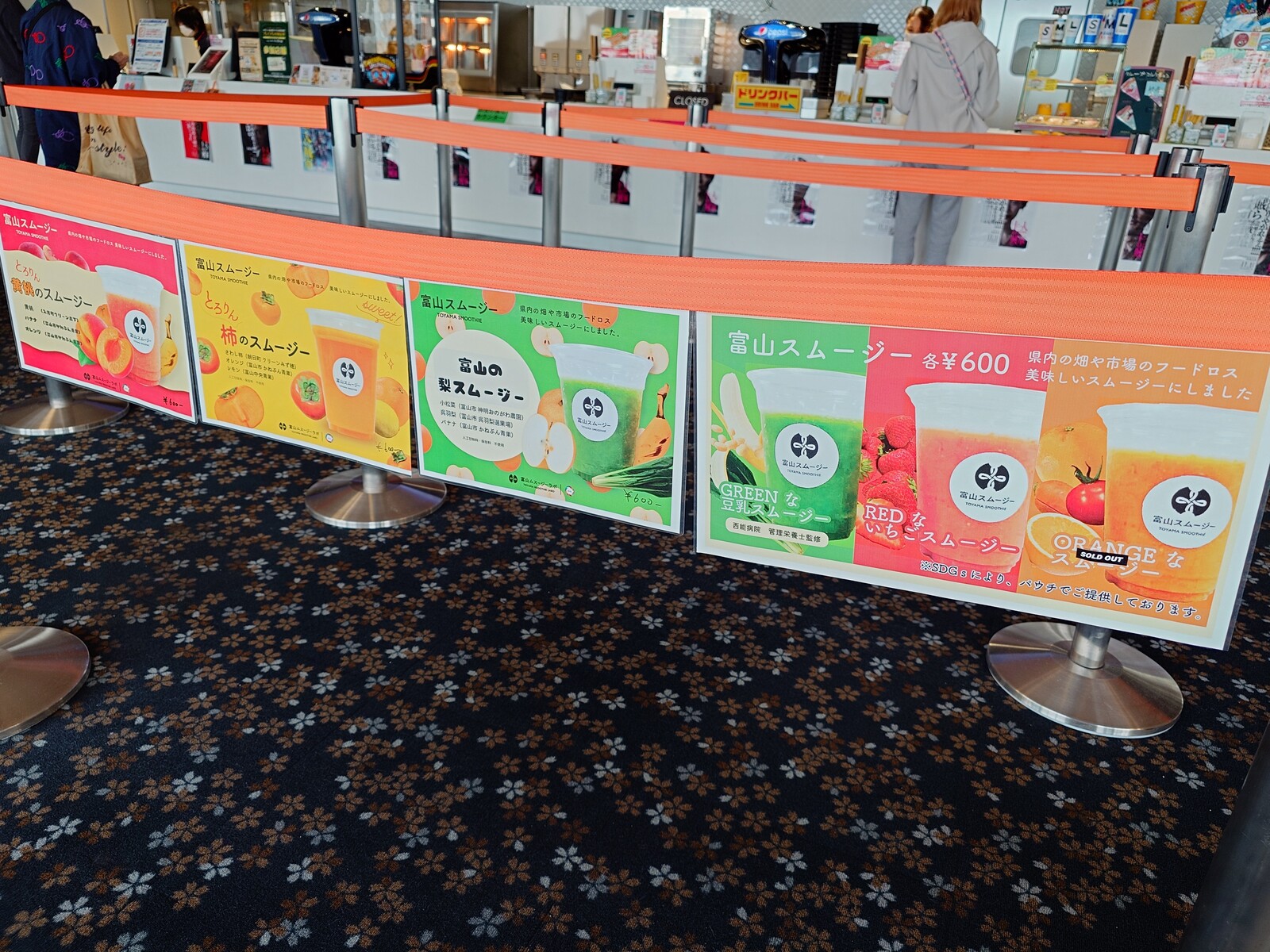 それは、この間、「J-MAXシアターとやま」で映画を見た日の話。何か飲みながら映画を見るのもいいかなと思っていたら、売店の前の通路にこんな垂れ幕がたくさん下がっているのを見つけたよ。『富山スムージー』とは、何とも気になるではないか。