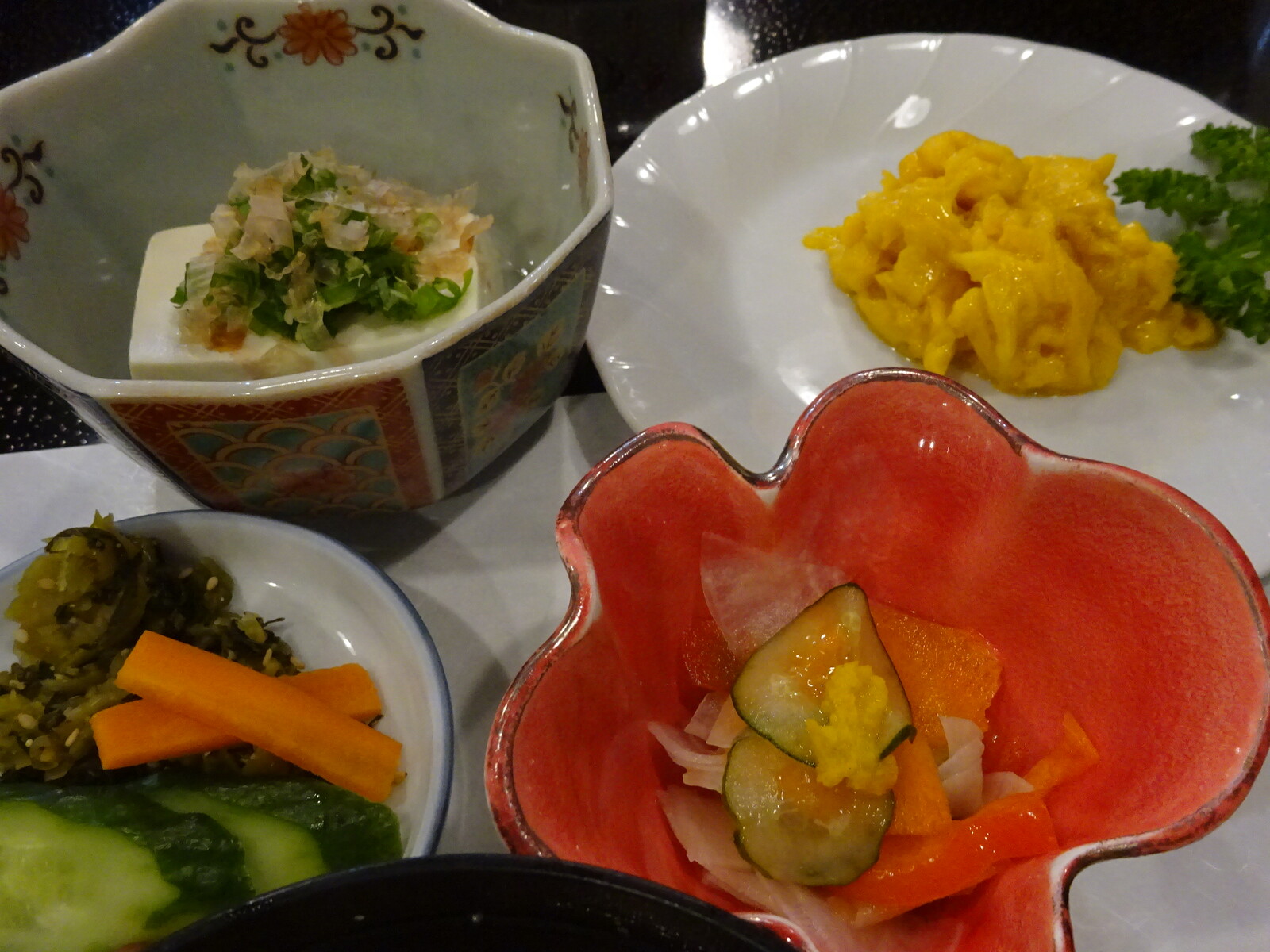 スクランブルエッグは、塩加減が絶妙。豆腐も漬物も酢の物も、味加減が絶妙。