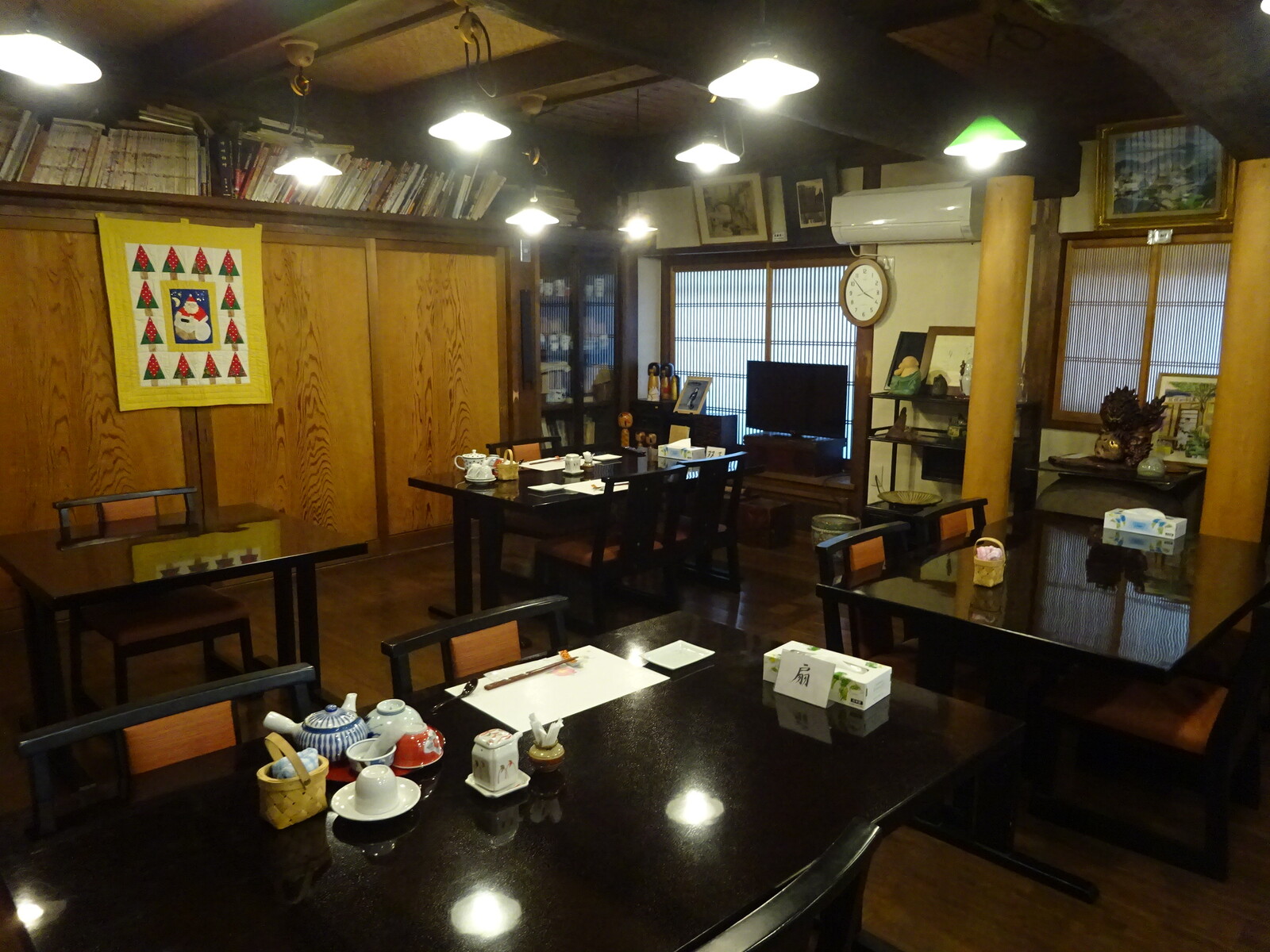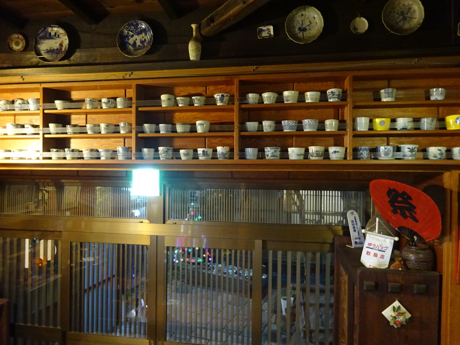 玄関を入って振り返れば、上には、古い湯のみがずらり。このレイアウトも渋いよねぇ。