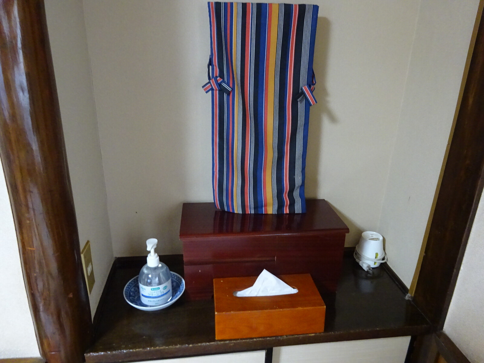 鏡台が置いてあって、それにかかってるカバーもまた、渋くていい感じなのだ。何だか、昭和な時代にタイムスリップしてきたみたい。ていうか、別府に来てからずっとそんな気分なんだよね。子供の頃って、こんな建物の中でこんなくらしをしてたよな、って思うばかり。