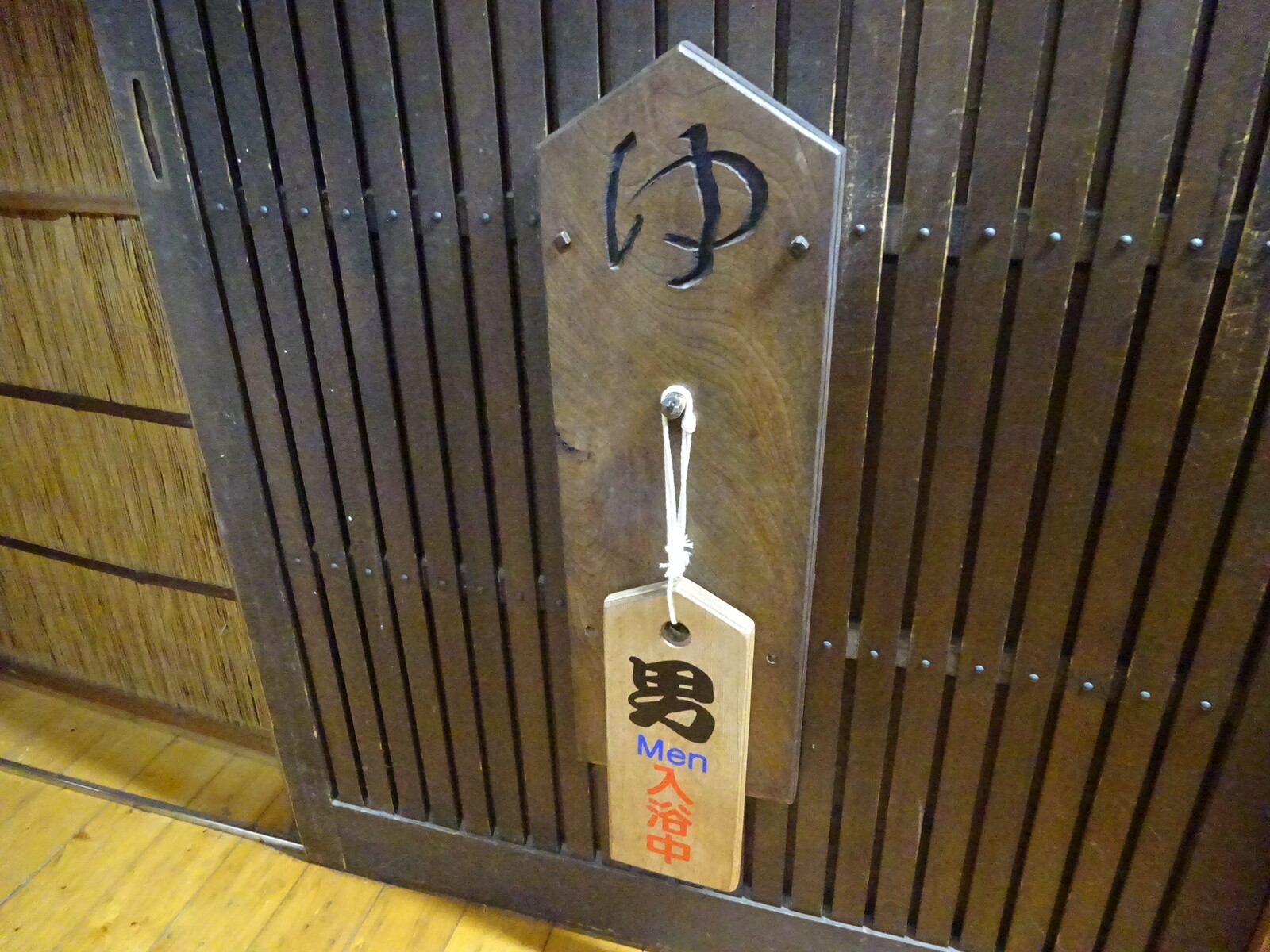 お風呂に入るときには、こんな札を下げておけば、ただいま入浴中だってわかる仕組み。中には、鍵もついているから、誰かが入ってくることもないんだ。