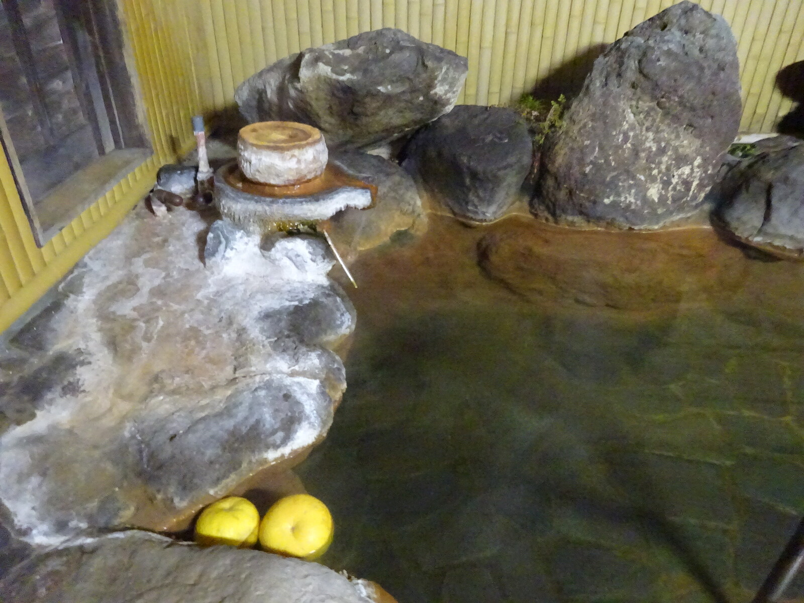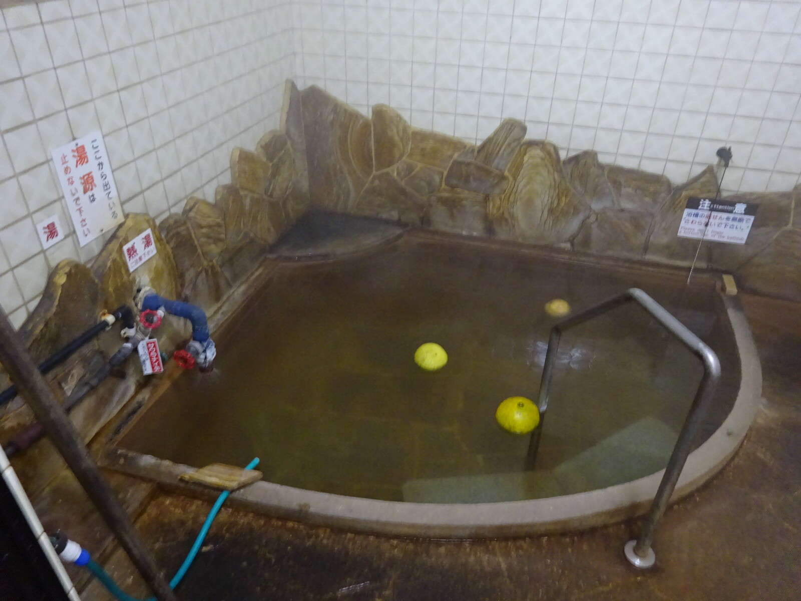 かくして、内湯の中をゆっくり写してみたよ。ザボンを浮かべてあるのが九州だよねぇ。けっこう熱い湯だけど、一人湯だからホースから水を出して適温にして入ってみたよ。いやぁ、いい湯だねぇ。