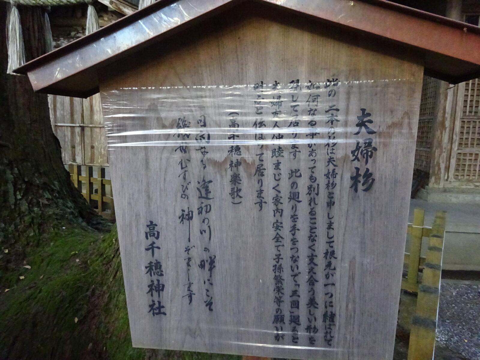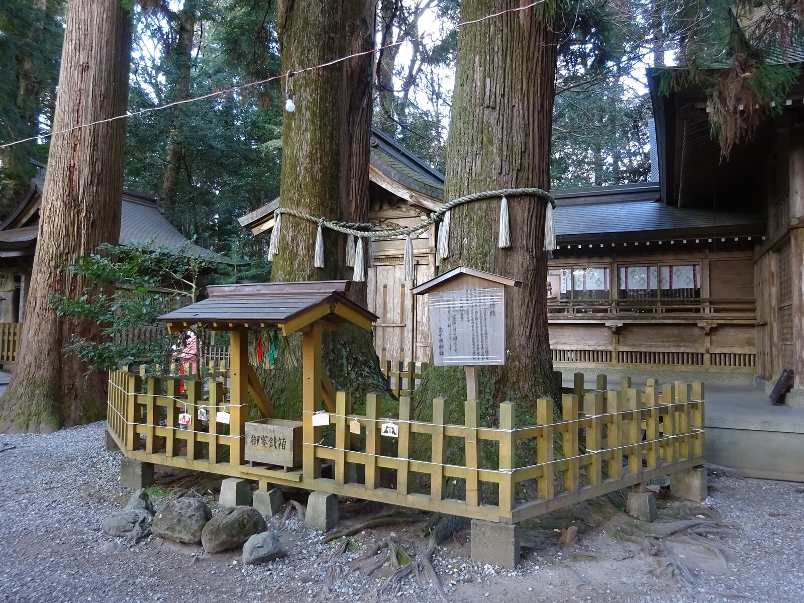 こちらの2本の杉は『夫婦杉』。根元が一つになっているから、いかなることがあっても分かれることなく支え合ってるんだって。このまわりを手をつないだまま3回まわると、仲睦まじく家内安全で子孫繁栄等の願いがかなうんだとか。