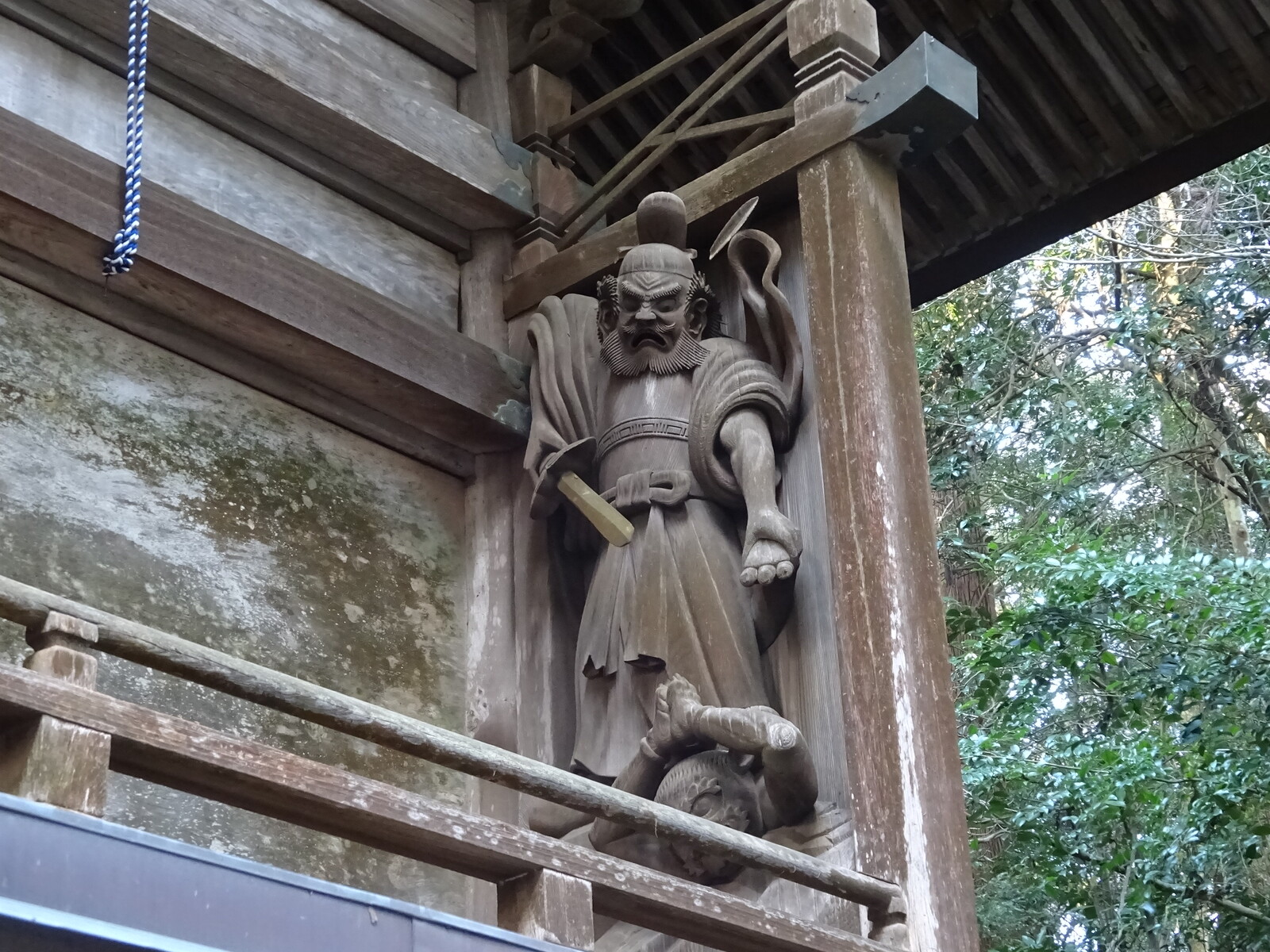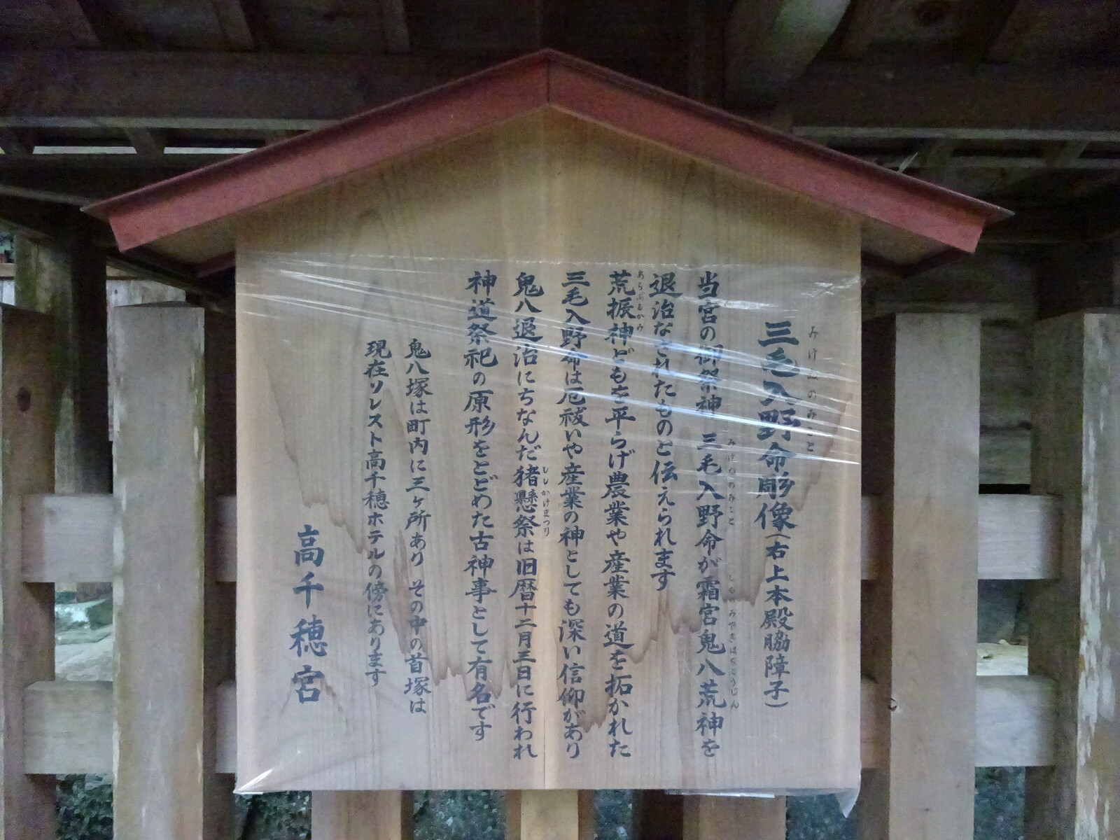 高千穂神社の御祭神、三毛入野命(みけぬのみこと)の彫像が本殿の右奥の柱に置いてあったよ。この命、神武天皇の兄という人物で、高千穂一帯を荒らしていた鬼神の鬼八を退治して、この高千穂宮を開いたと伝えられているんだ。神武天皇って、初代の天皇でしょ。何とも由緒あるお話