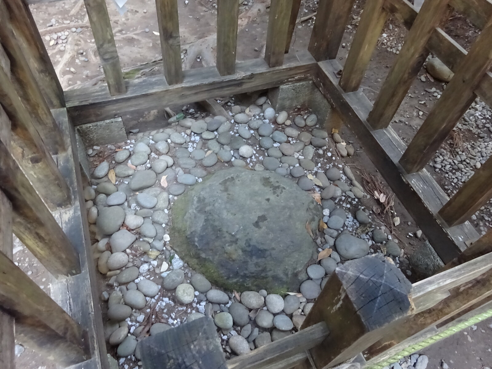 こちらは本殿の東にある『鎮石(しずめいし)』。垂仁天皇(第11代)の勅命で、伊勢神宮と高千穂宮が創建されたときに用いられた古石と伝えられてるんだって。この石に祈ると個人の悩みから世の乱れまでの一切が鎮められるらしいよ。