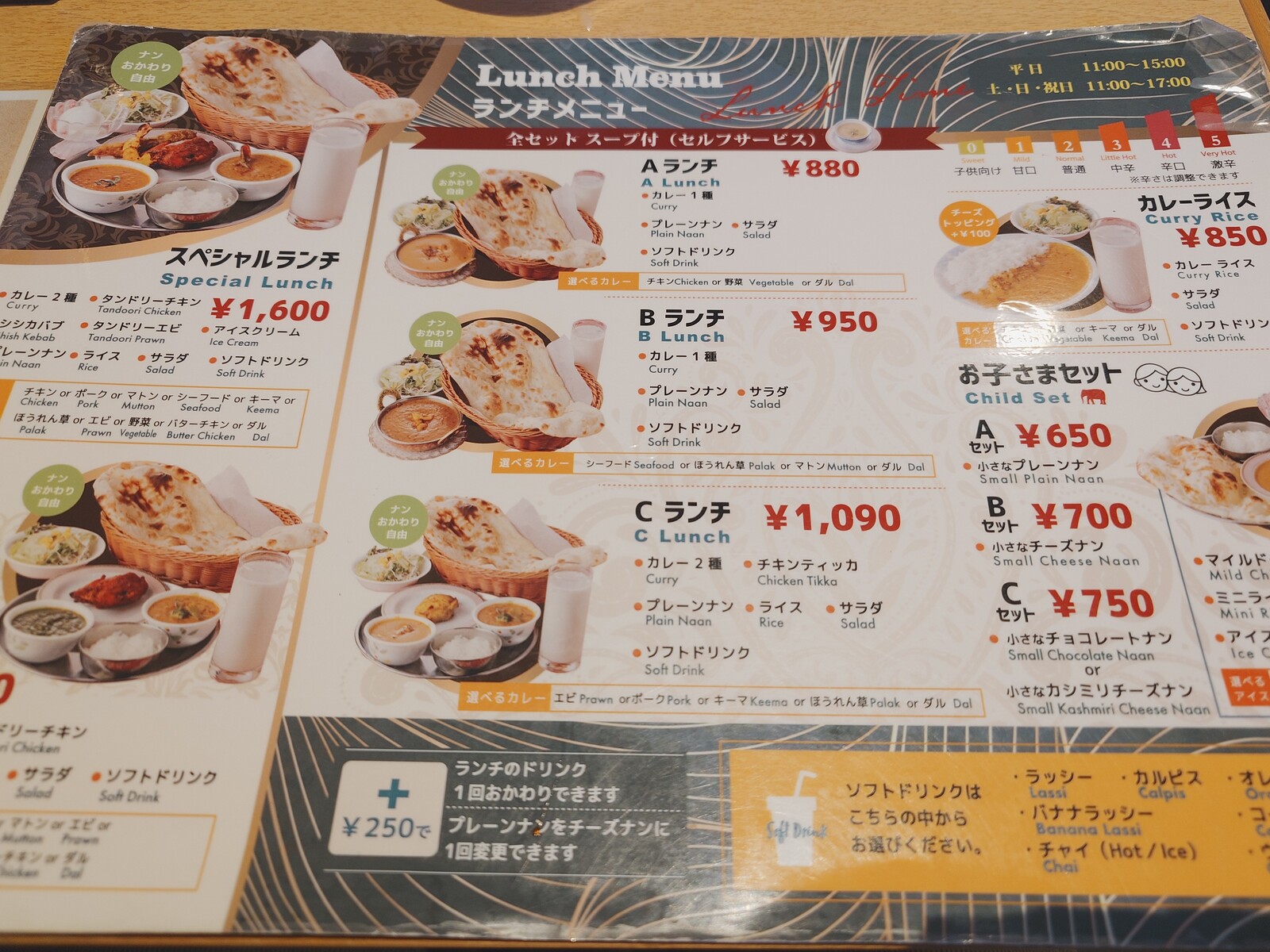 このタイプのインド料理屋さんらしく、メニューは多彩。