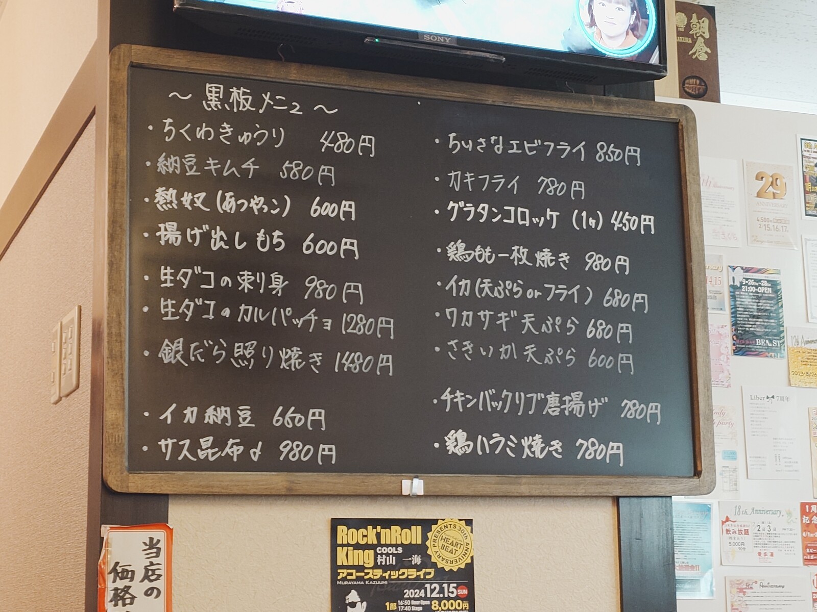 黒板メニューも気になるところ。『さきいか天ぷら』って大阪っぽいメニューも気になる〜。この店、揚げ物が得意なお店、といった感じだね。