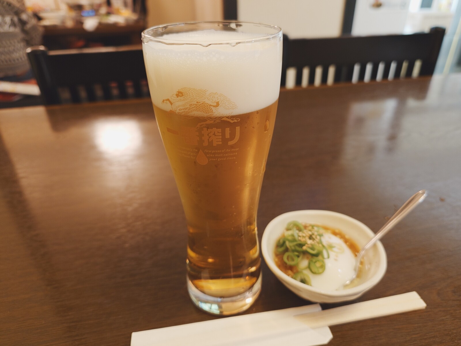 この日は、太田口通りの居酒屋「和処てつ」で、一人飲みしてみたんだ。まずは、『キリン一番搾り』を生でいただこう。お通しに『温泉たまご』だなんて、ボクの好みをわかってる?