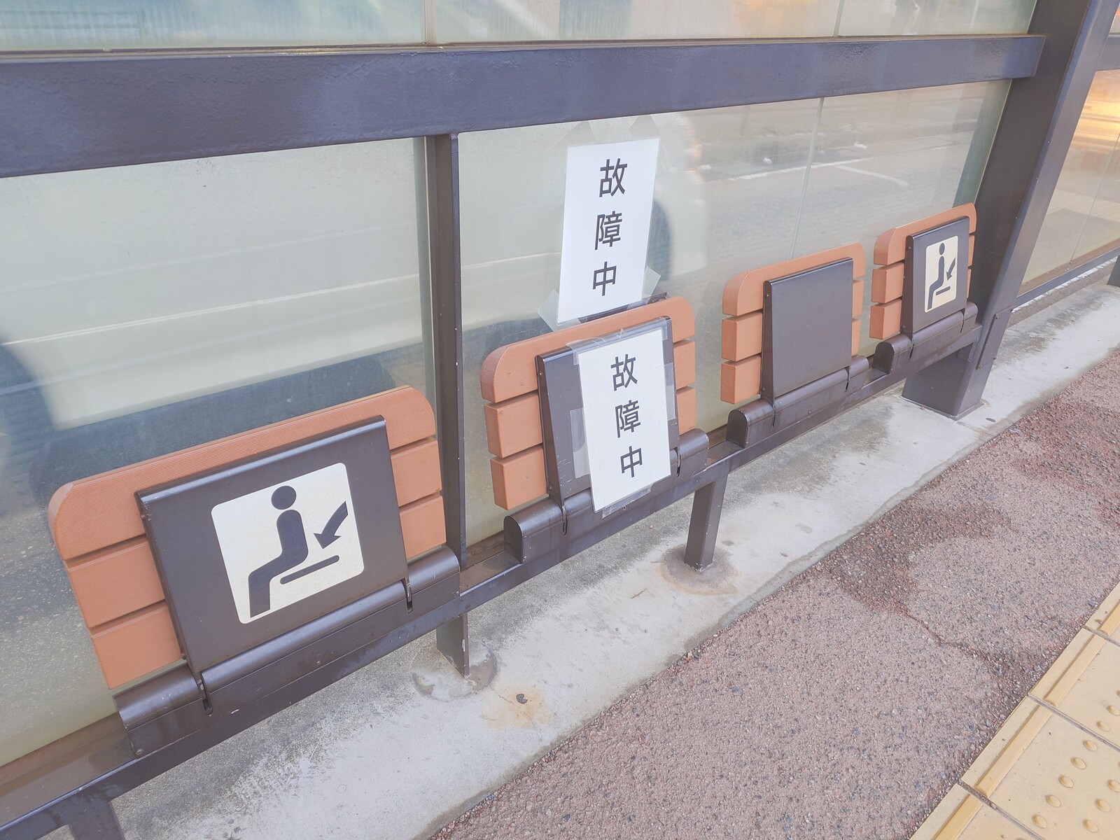 。どうやら、椅子が一つ使えなくなっている様子。「中町」の電停ならば、県内外はもちろん、外国人の観光客だってたくさん立ち寄るだろうスポットだよね。そんな富山の大事な観光資源である市電の停留所に、こんな隙を見せてはいけないと思うのは、ボクだけだろうか。