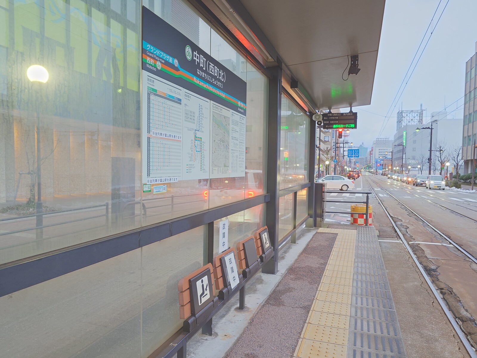 環状線の停留所は、どこも屋根付き、折り畳みシート付になってるのがありがたいよね。中町停留所は、南富山行に接続できるよう、後からできた新しい造りのはずなんだけど・・・、