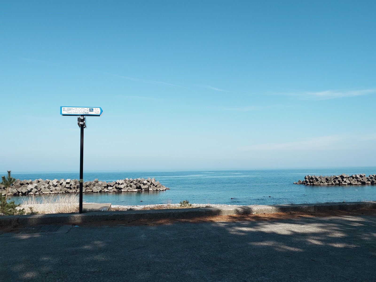 「あさひ総合病院」の横を抜けてさらに北に進めば、5分弱で海岸線に到着。「富山湾岸サイクリングロード」が折れ曲がって、街中へと向かう三叉路になっていたんだ。ここからは、海沿いに西に向かった歩いてみたよ。