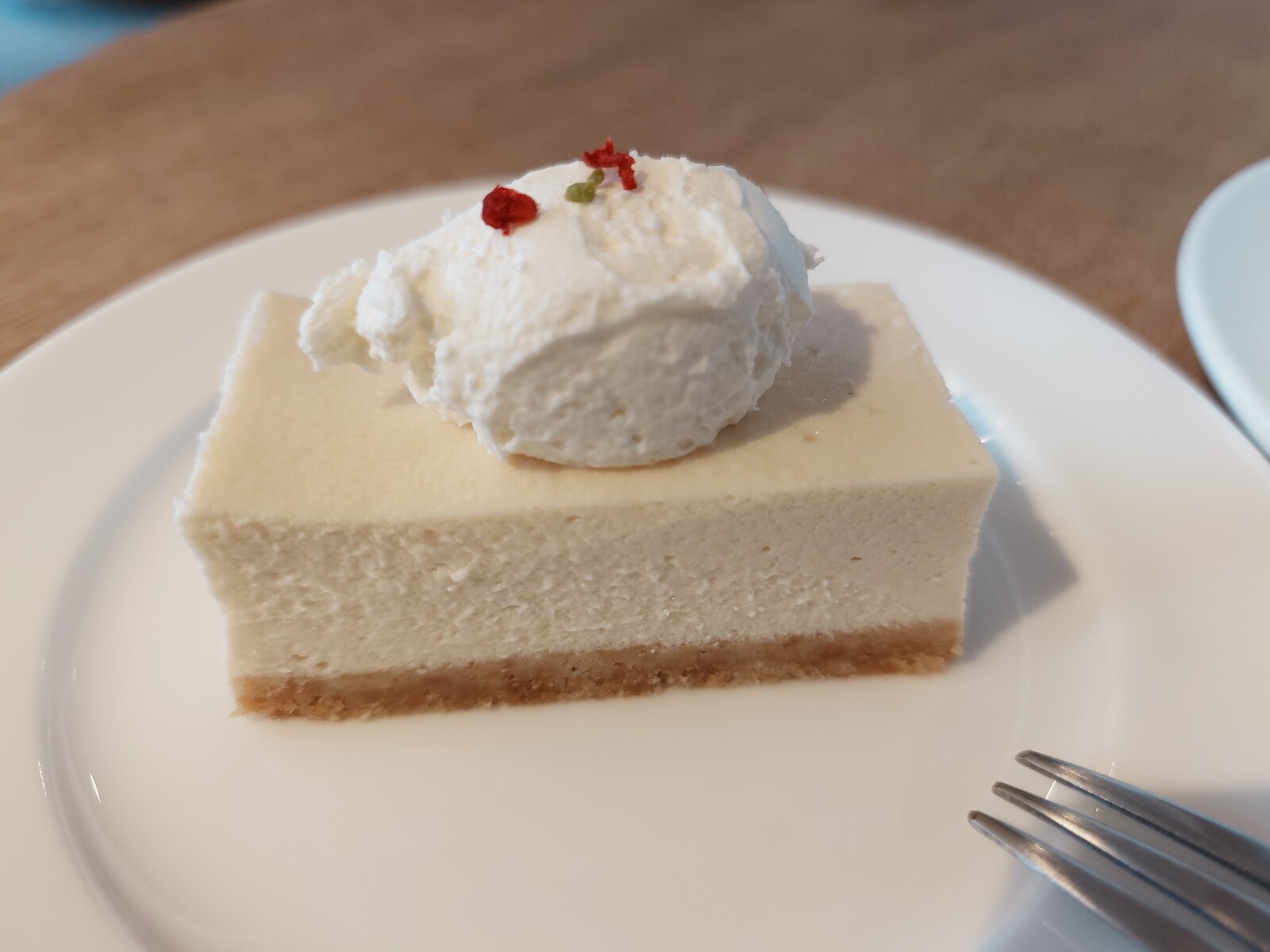 『レアチーズケーキ』は、チーズの味がしっかり目で、でも濃すぎるわけでもないという、バランスの実によいスイーツ。一口含むと口の中で溶けていくんだけど、鼻の奥に残る香りがとても心地よいんだ。上にのってるかためのクリームは、甘さが控えめなのがさらによろしいよね。