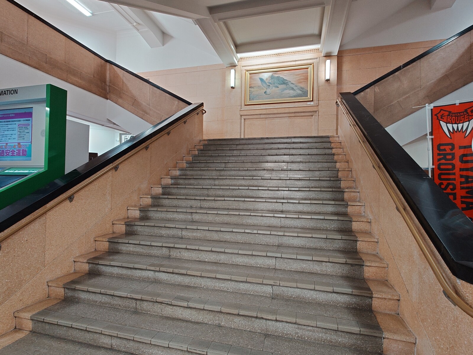 スロープを登ったところが正面の入り口。中に入ると、中央の立派な階段が、来客を迎えてくれるんだ。こういう造りが、何とも昭和レトロな雰囲気だね。