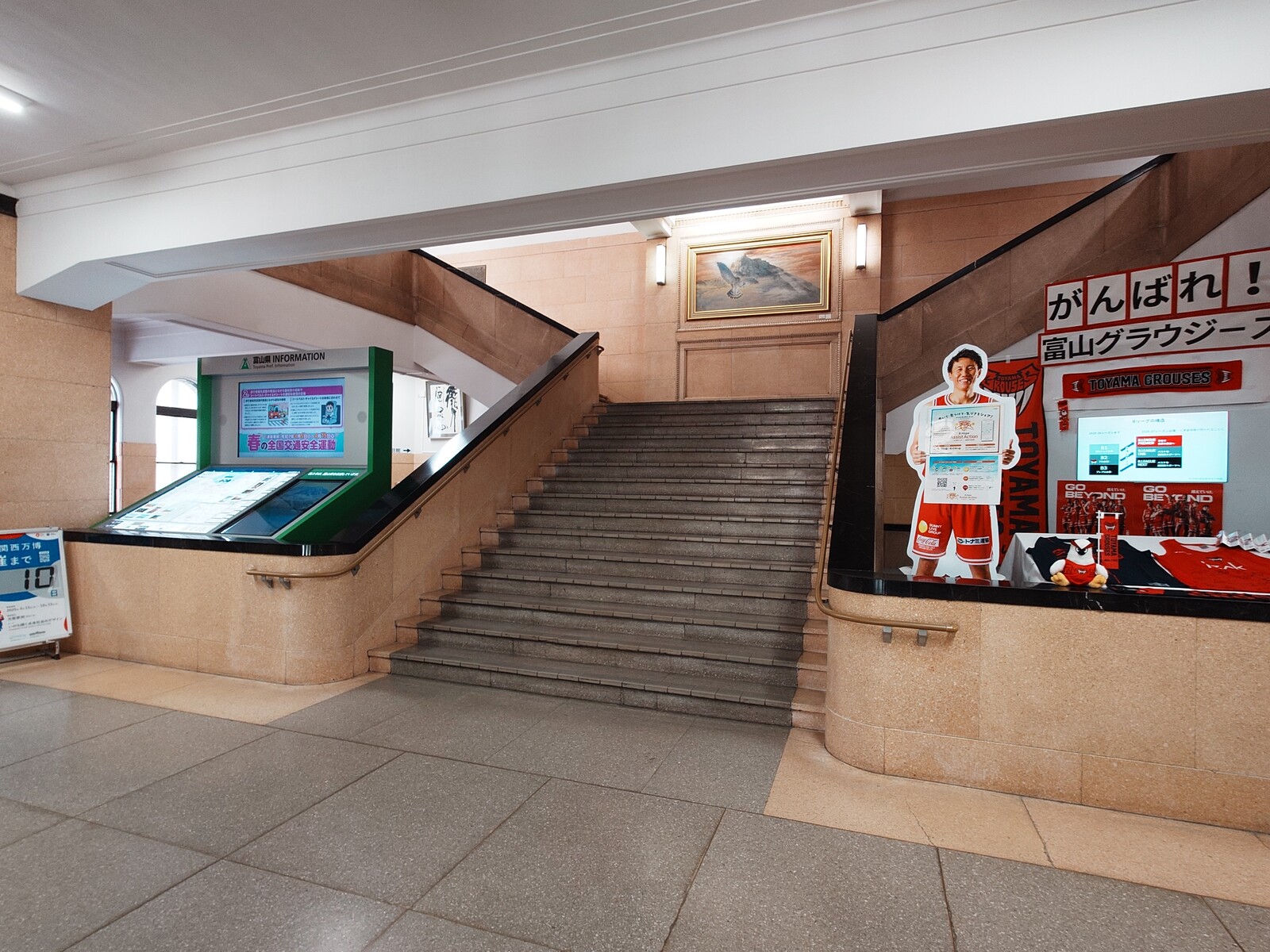 階段わきのスペースには、バスケットボールチーム、富山グラウジーズの応援パネルが飾ってあったよ。リーグの編成替えに向けて、県も応援しているんだね。