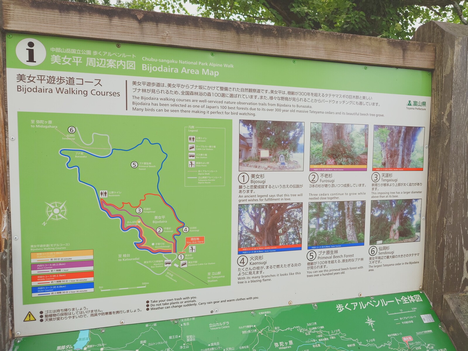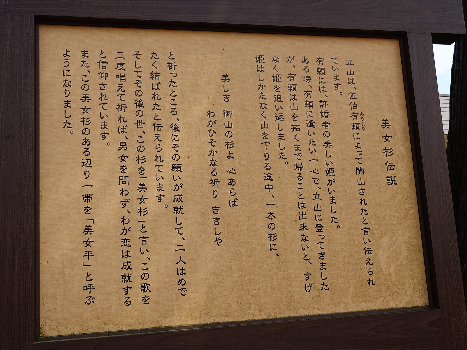 でも、今の美女杉横の案内板には『許婚者だった美しい姫が、開山のために立山に登っていた佐伯有頼と離れ離れになり、木の神に再会を祈ったところ願いがかなった』という伝説が書かれているよ。この願いかなったことから、この木が「美女杉」と呼ばれるようになったんだってね。