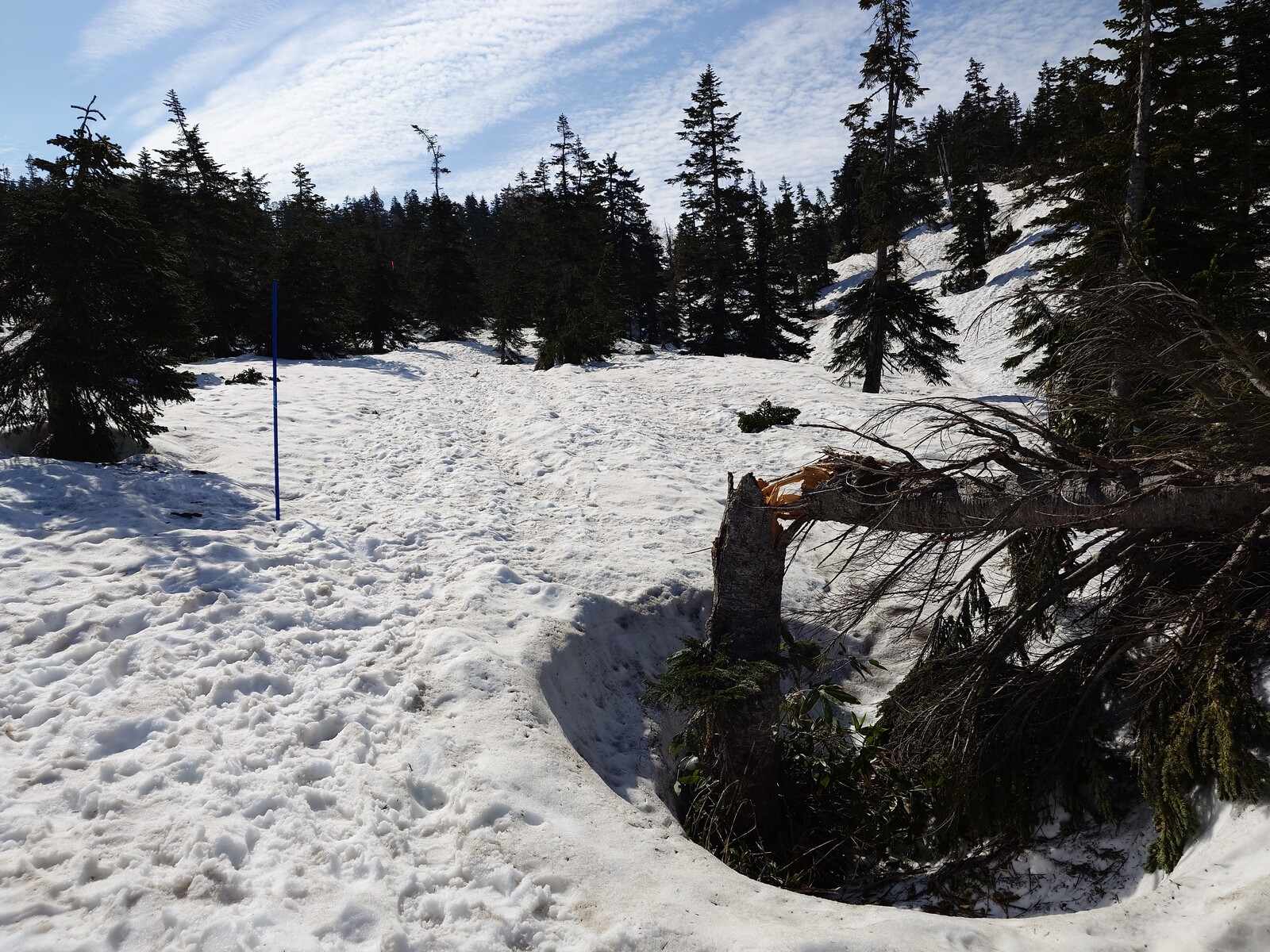 登山道は、数mも歩けば、雪におおわれていたよ。太い木が雪の重みで折れた横を歩き・・・、