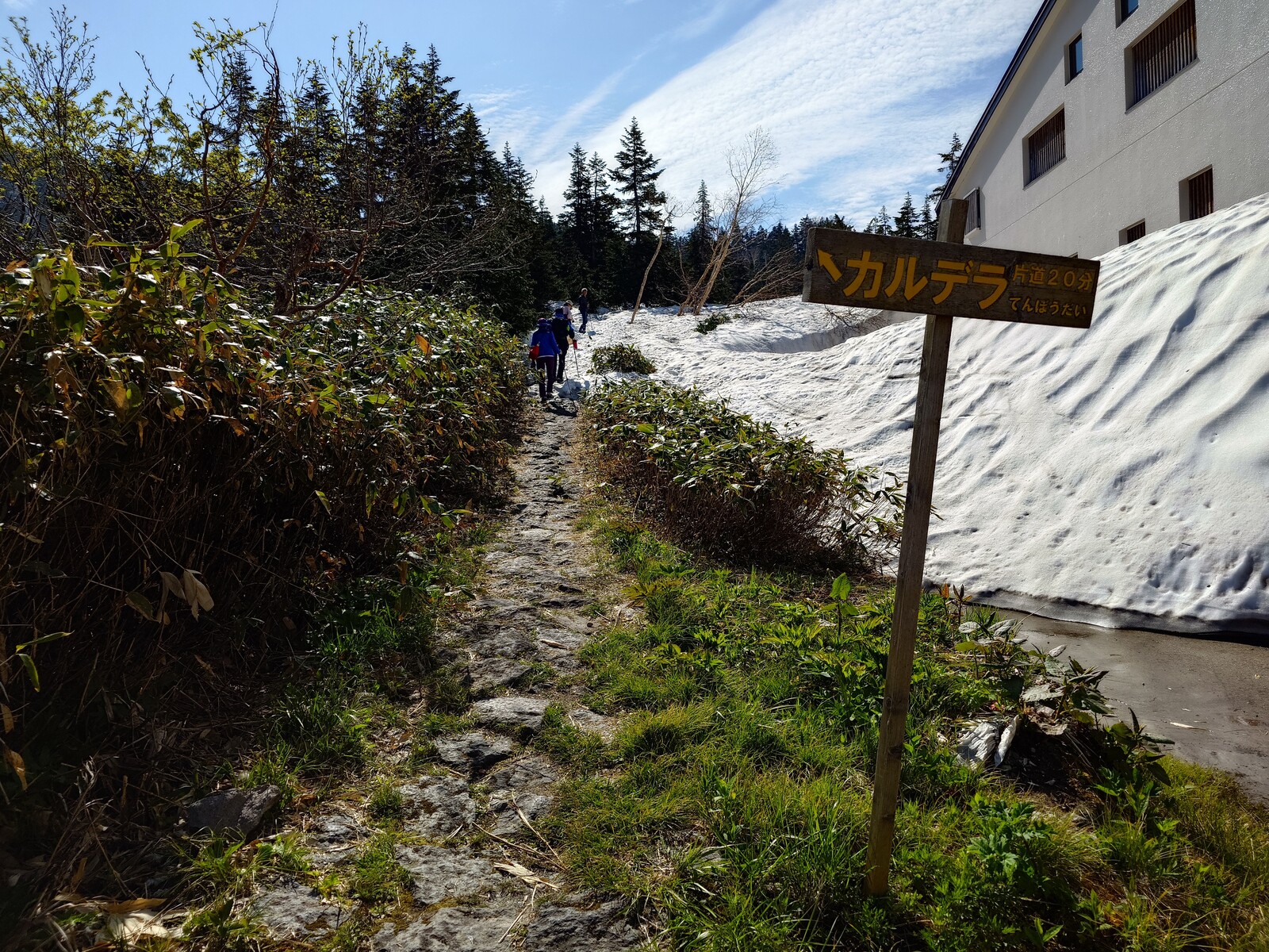 この建物を正面に見た左手に、「立山カルデラ展望台」へとつながる登山道があるよ。どんな風景か気になったから、天気のいい日に登ってみたんだ。