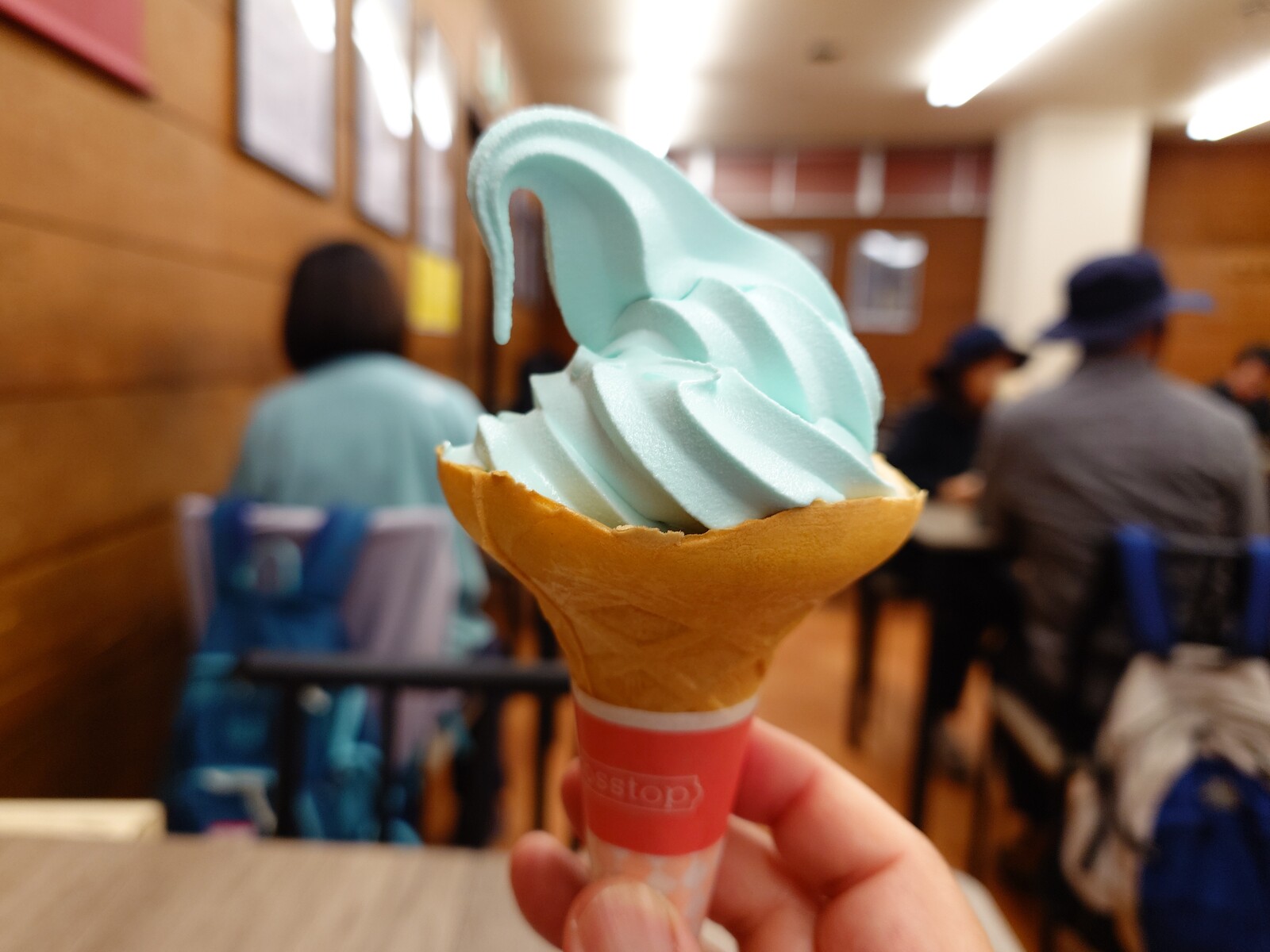 注文したのはこちら。『みくりが池ソフト』だよ。ソフトクリームらしからぬ色だけど、『みくりが池ソフト』のネーミングにはふさわしいカラー。この色なのは、ラムネ味だからなんだって。