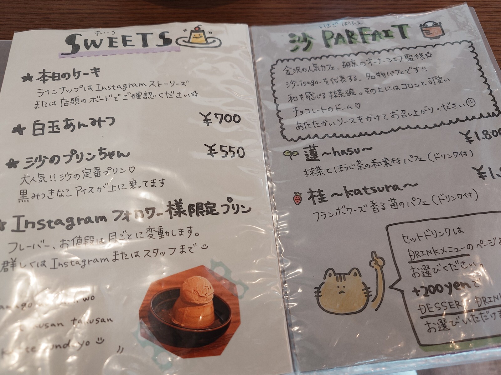 店にあわせてか、スタッフは、若い女子が多数。お客さんも、自分以外は全員女性だった(苦笑)。そして、この日注文したのは、『沙ブレンド』と『沙のプリンちゃん』。