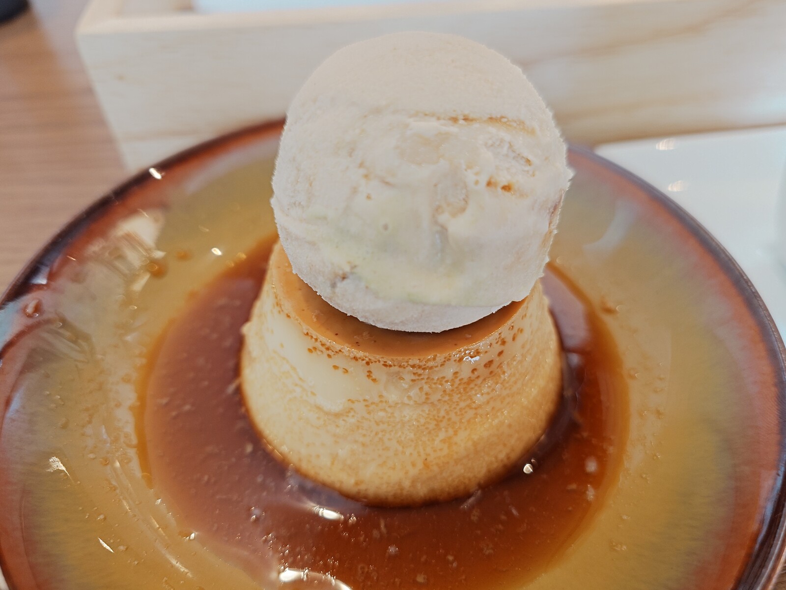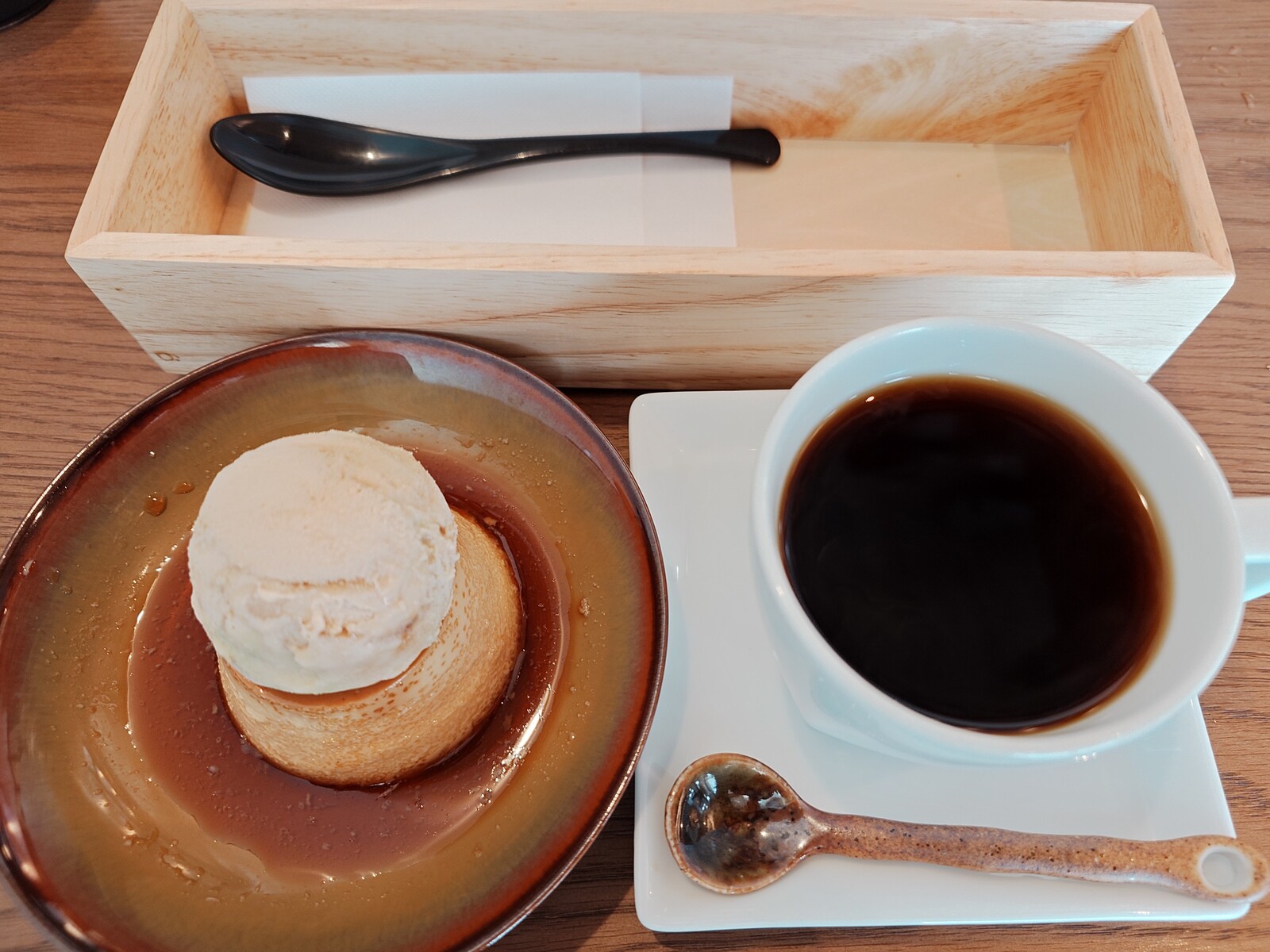 『沙のプリンちゃん』には、黒糖きなこアイスがトッピング。プリンはシンプルで固めの、昔ながらの、という言葉がぴったりくる味。アイスの味わい自体は、黒糖ときなこの取り合わせが実に個性的なんだけど、これはこれで、プリンと味を支え合っていて、一緒に食べてよし、単独で食べてよしの絶品だった。アイスにはタピオカも入っていて、その食感も面白いぞ。