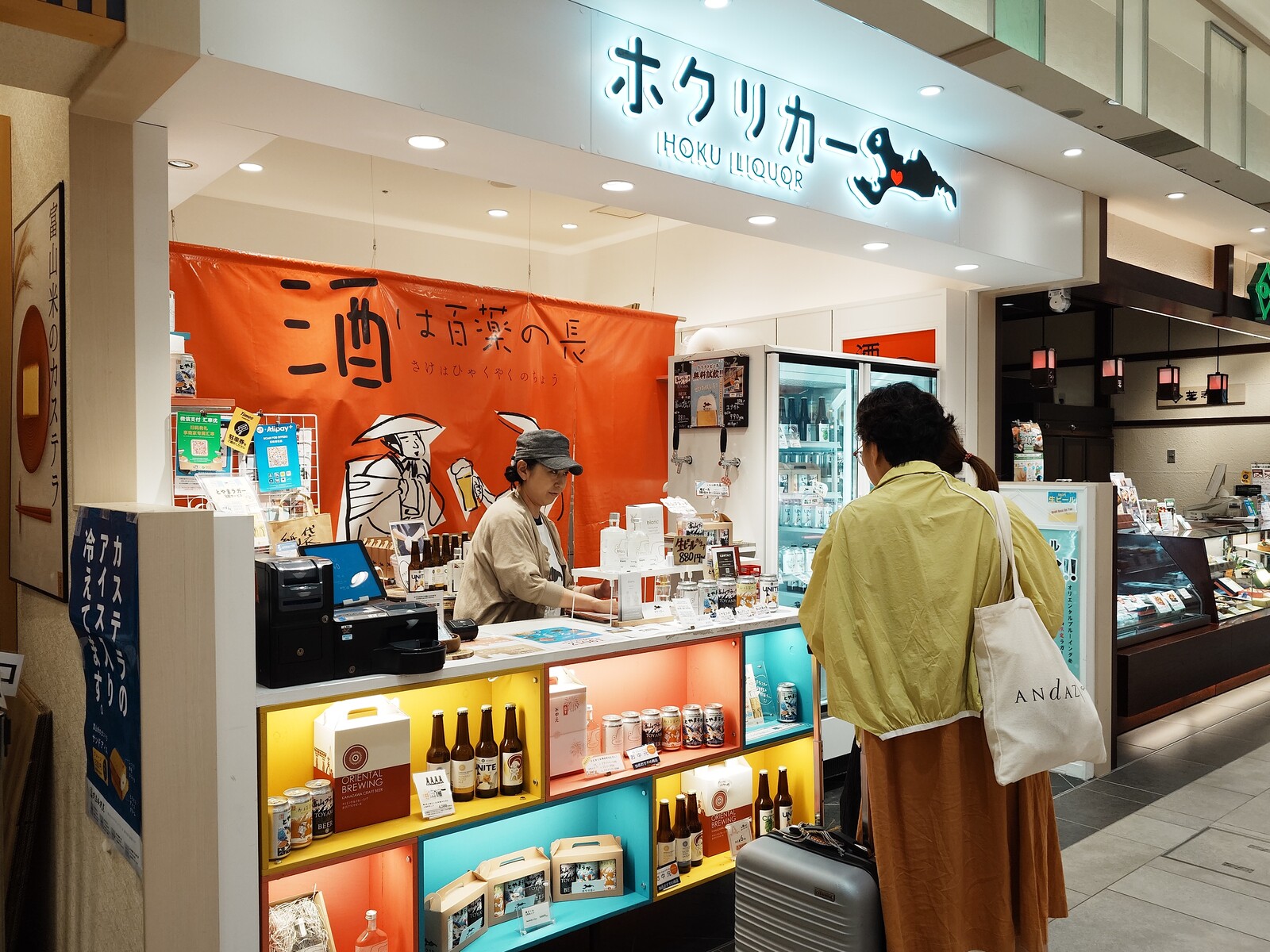 「ホクリカー」は、金沢のクラフトビールメーカー「オリエンタルブリューイング」がとやまルシェ内にオープンさせた、自社製品の販売店。マリエとやま1階の店舗で飲める地ビール缶の他に、富山オリジナルの商品も販売しているよ。『とやまラガー』もそのひとつなんだ。