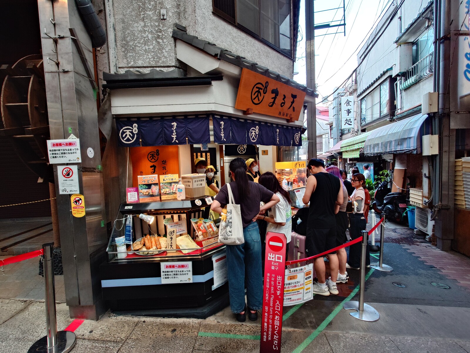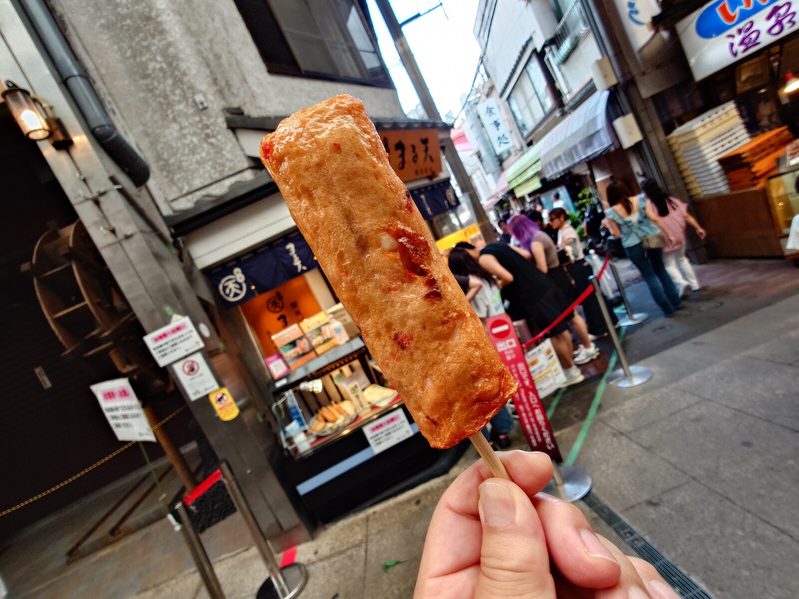 JR熱海駅前にある「平和通り名店街」には、温泉まんじゅうやレモンを使った焼き菓子、干物、かまぼこといった商品を並べる店が建ち並んでいるんだ。この「磯揚げまる天熱海駅店」も、そんな中にある一軒。横の路地に長い行列ができてるここは、具材を入れ込んだすり身揚げ『磯揚げ』を食べられるお店だよ。