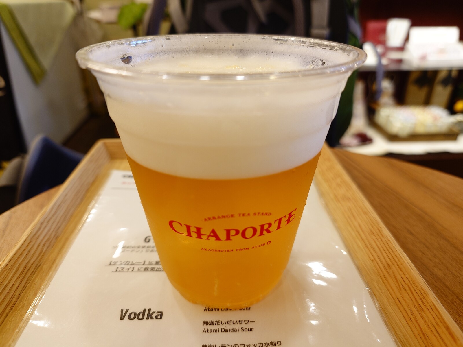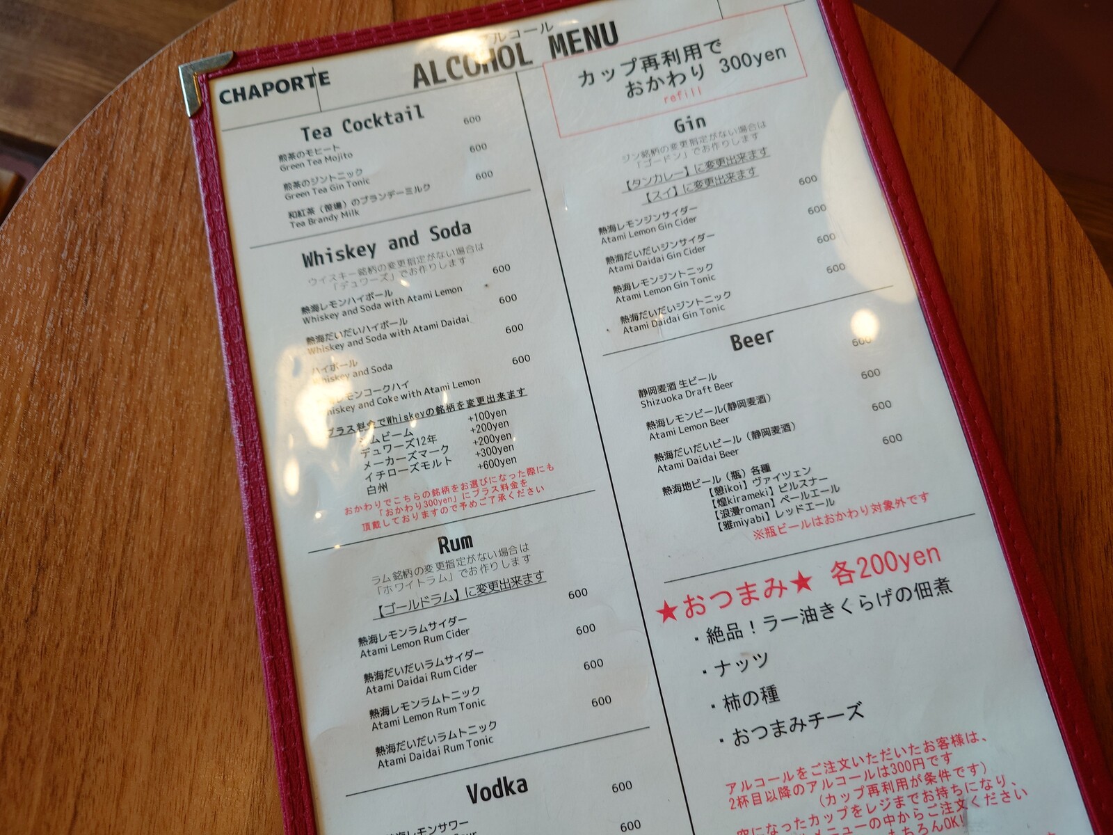 こちらの店にも、テーブルがたくさん並んでいて、飲み物片手に一休みできるようになっているんだ。はじめは『熱海だいだいネード』と『チーズケーキ』とも思ったんだけど、見つけてしまったんだよね。アルコールメニューを。