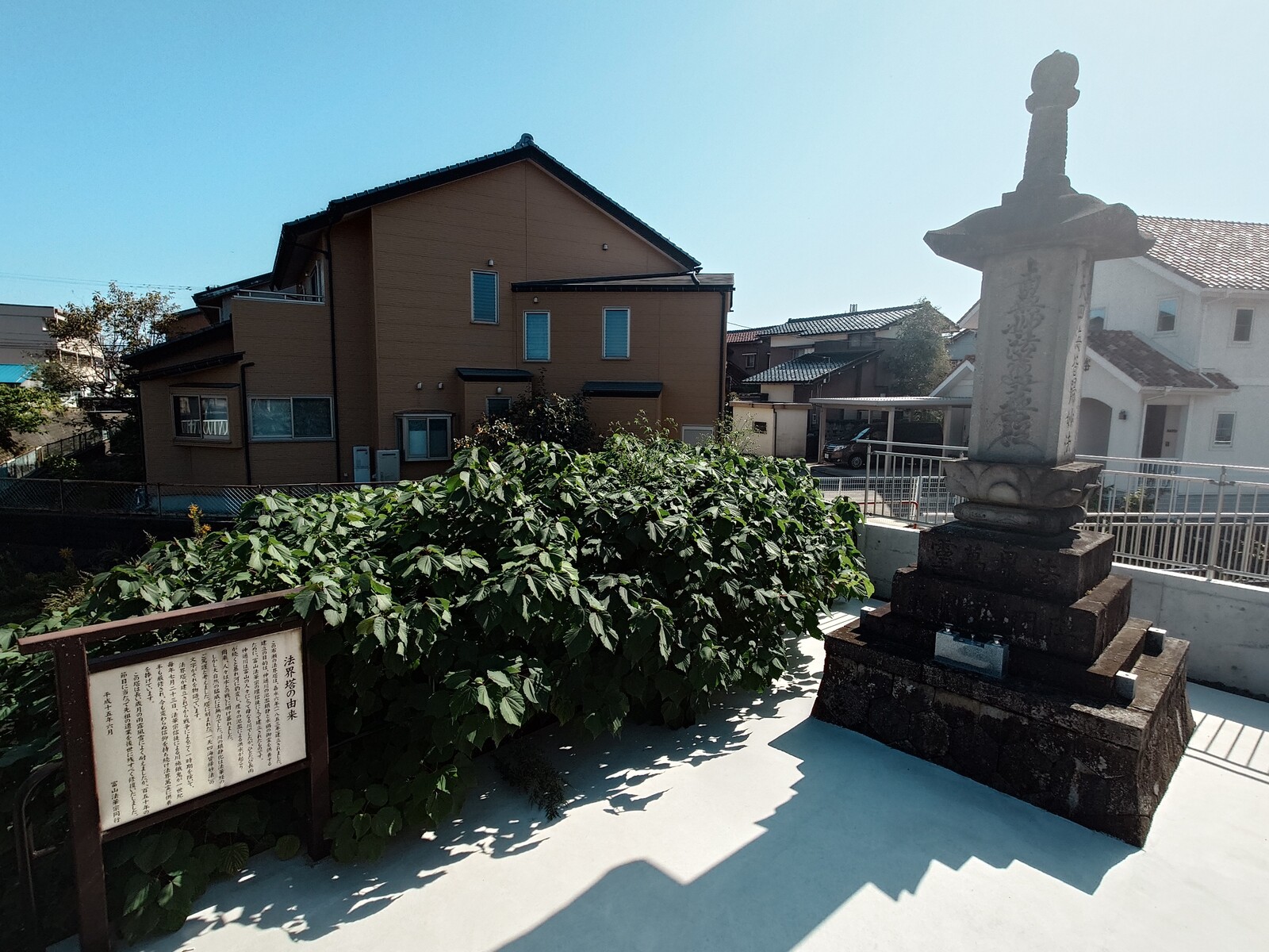 嘉永6(1853)年に建立された法界塔。神通川の氾濫をしずめ、水害で亡くなった人々の魂を慰めるために、富山法華宗の信徒が建てたんだって。できてから、かれこれ170年も経つ、富山の歴史をずっと見つめてきた石碑なんだ。