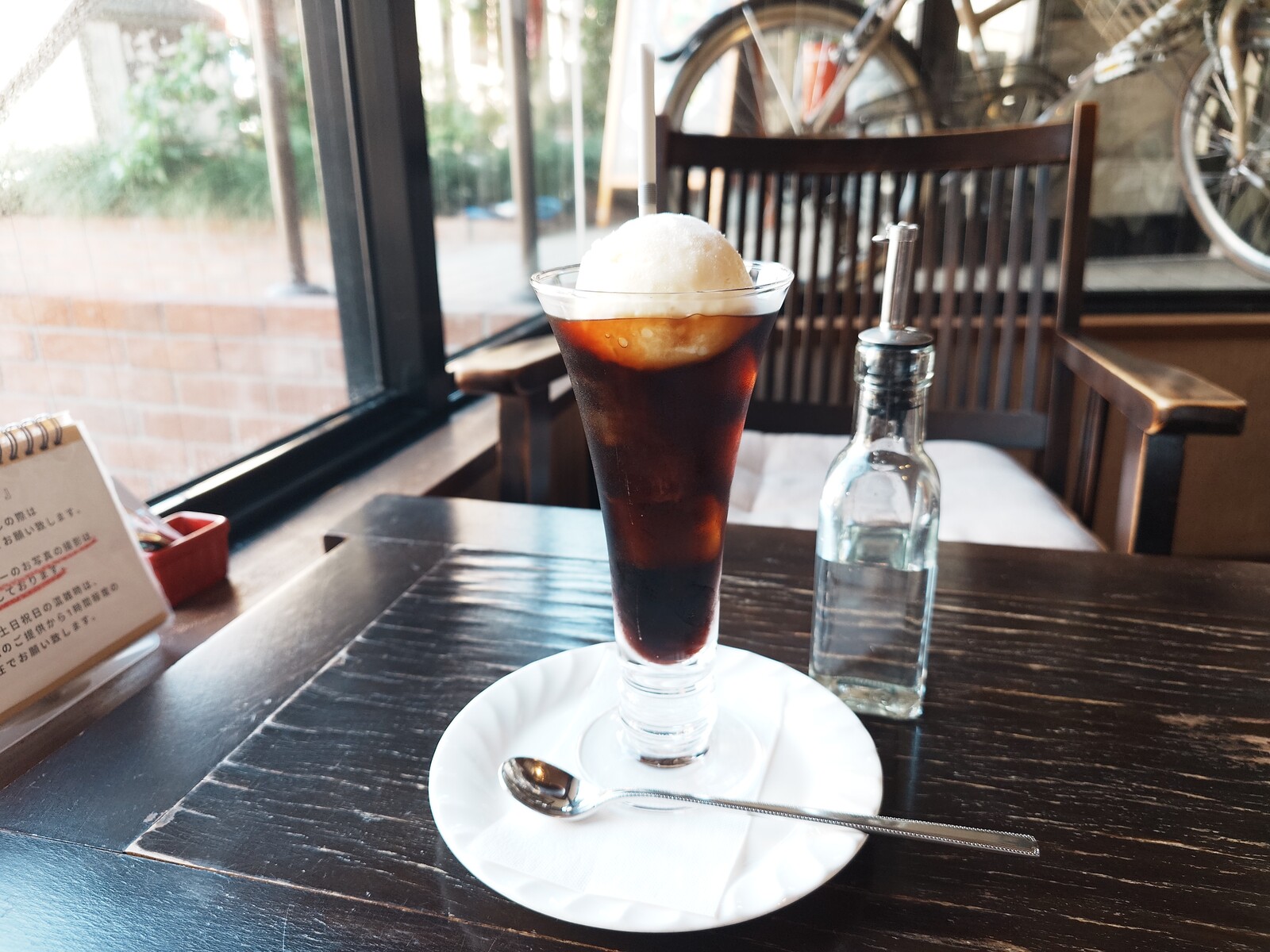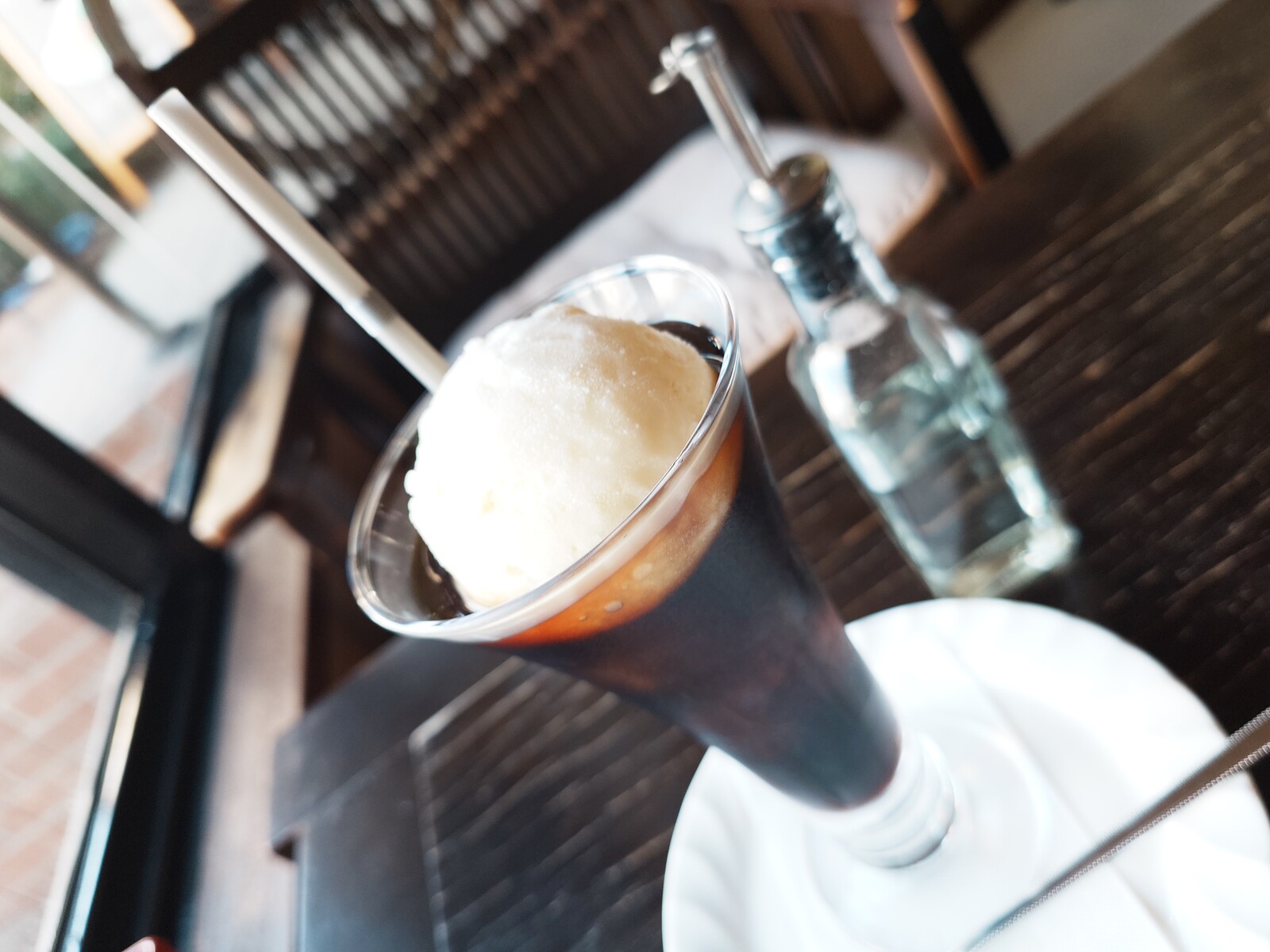 この日は、『コーヒーフロート』を注文したよ。苦味の効いたコーヒーに、アイスが少しずつ溶けてだんだん甘くなっていくのを楽しみながらいただくんだ。