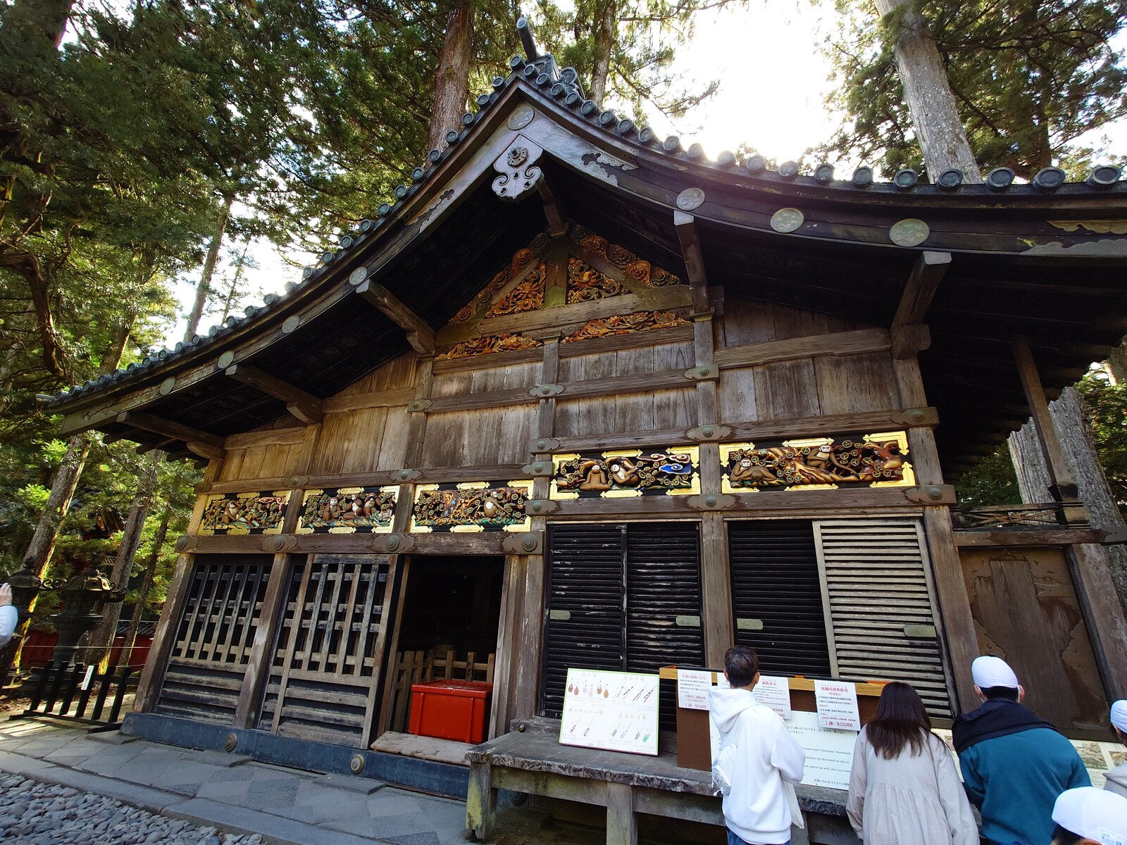 見ざる、言わざる、聞かざるの三猿が刻まれるのは「神厩舎」。実は、厩=馬小屋なんだけど、これも重要文化財なんだって。どこもかしこも重要文化財だらけだし、こんなのまで重要文化財になるとは。