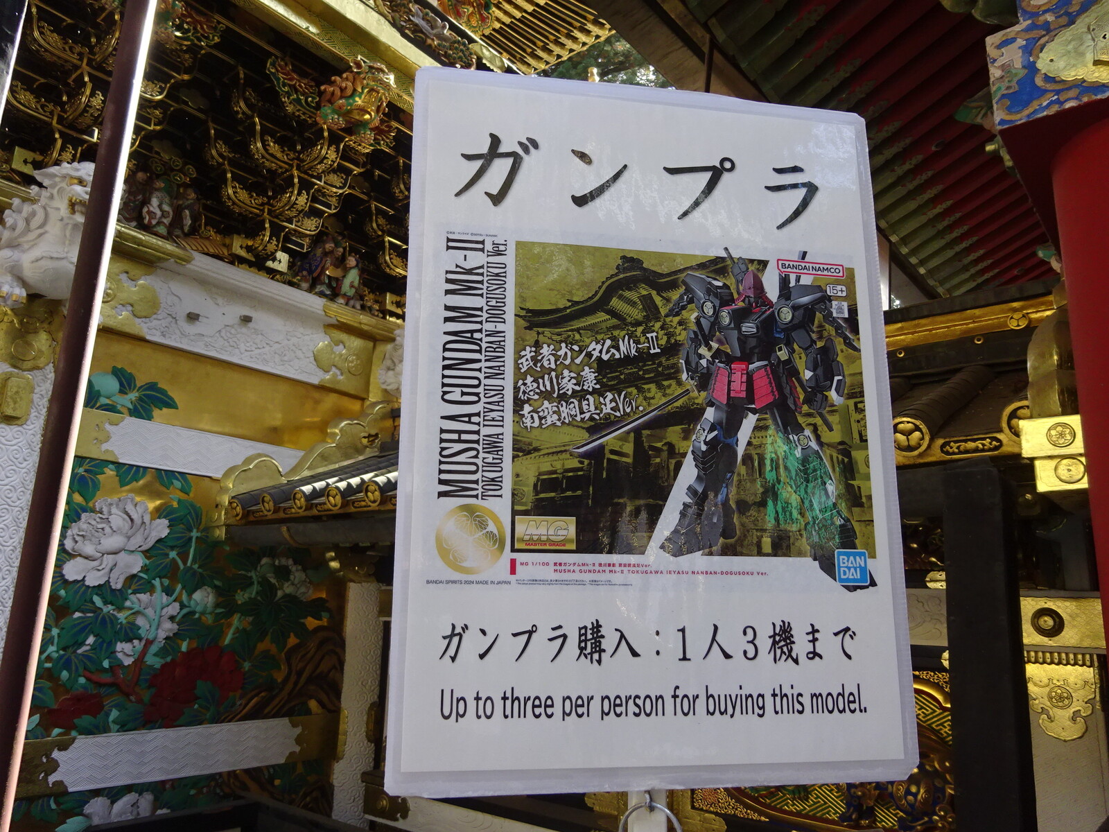 バンダイが、武者ガンダムを奉納したとかで、そのガンプラが展示されてたよ。徳川家康の南蛮胴具足をモチーフにしてるんだって。