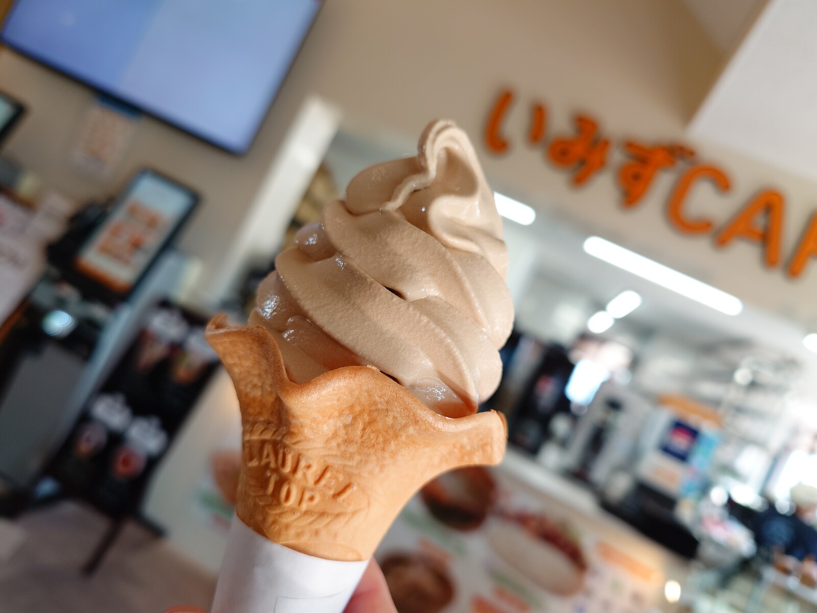 この間、射水市の国道8号線沿いにある「道の駅 まるごと射水」を訪れたときに、「いみずCAFE」で『コーヒーソフトクリーム』を食べてみたんだ。