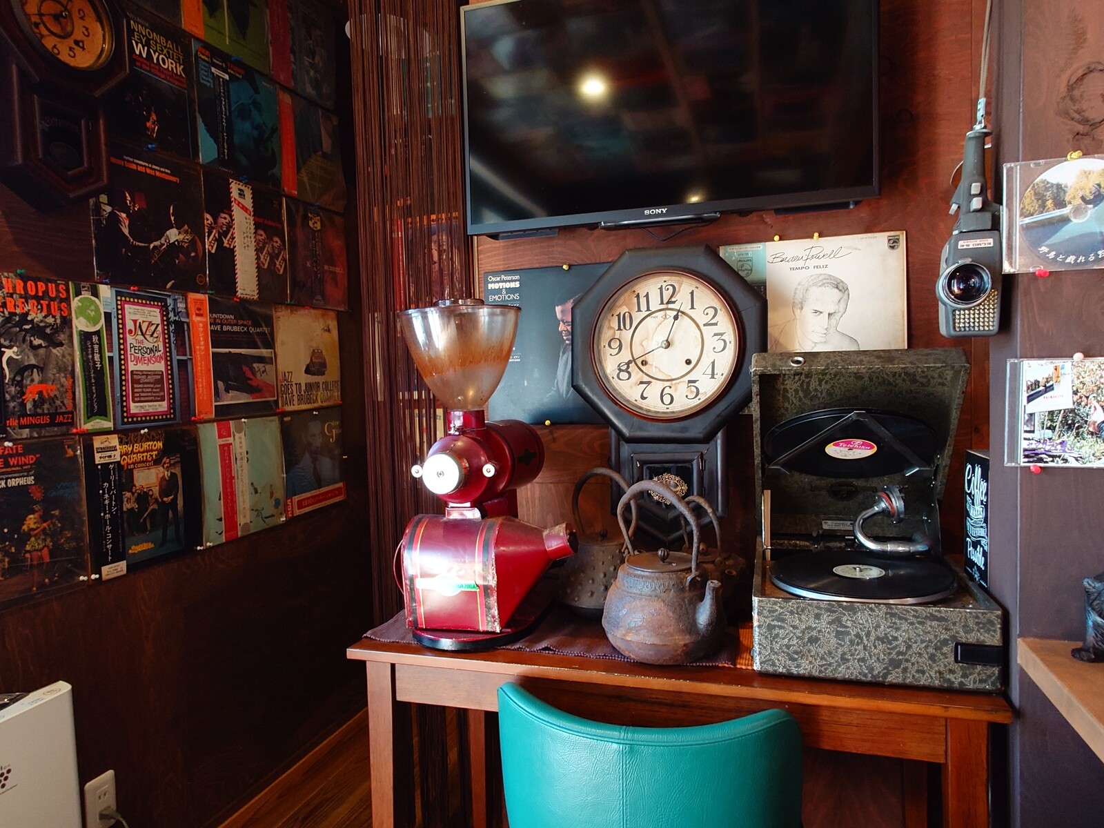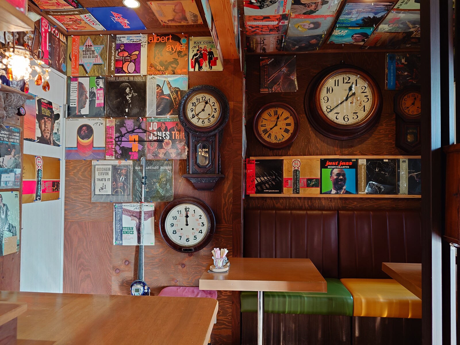店の壁や天井に古いジャズのレコードがぎっしりディスプレイされていた。