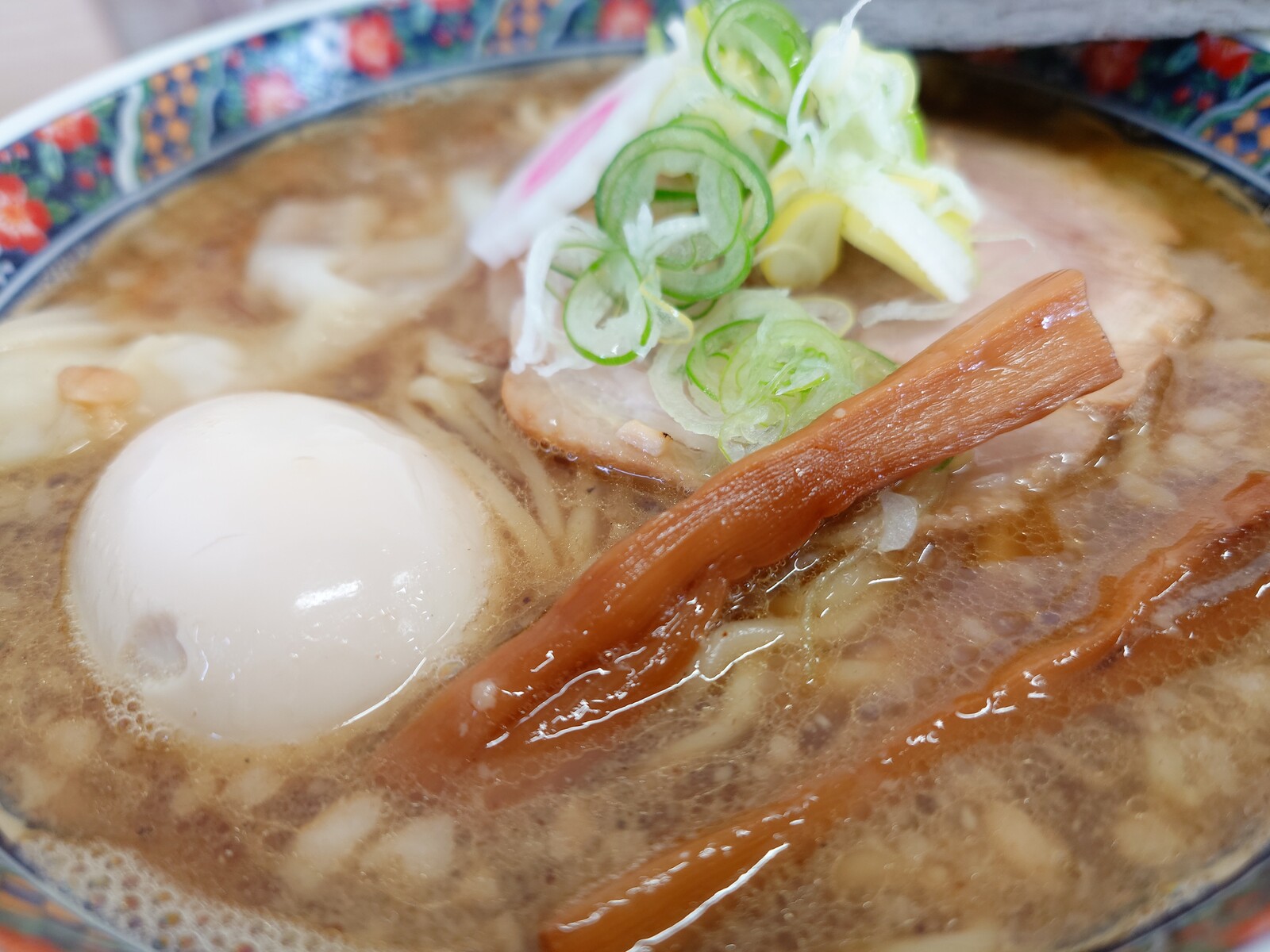 『醤油らぁ麺』に味玉とワンタンを1個トッピングしてある。