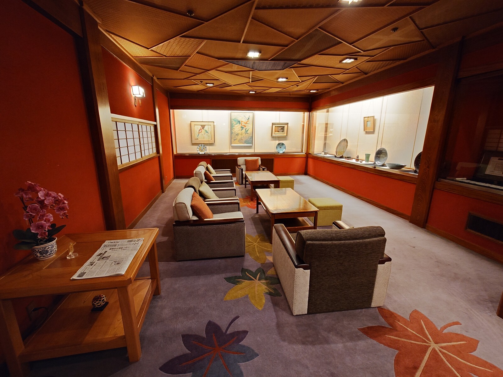 ロビー脇の休憩スペースには、ショーケースに様々な品々が飾ってあるんだ。
