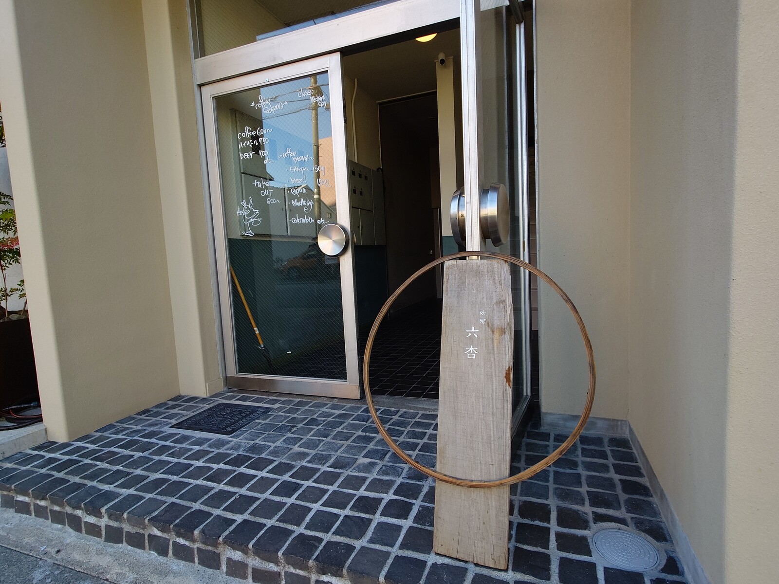 「珈琲」と書いてあるからにはきっとカフェに違いないけど、あえて目立たない感じにしてるところがクールな感じだよね。お店の名前は「珈琲 六杏」。
