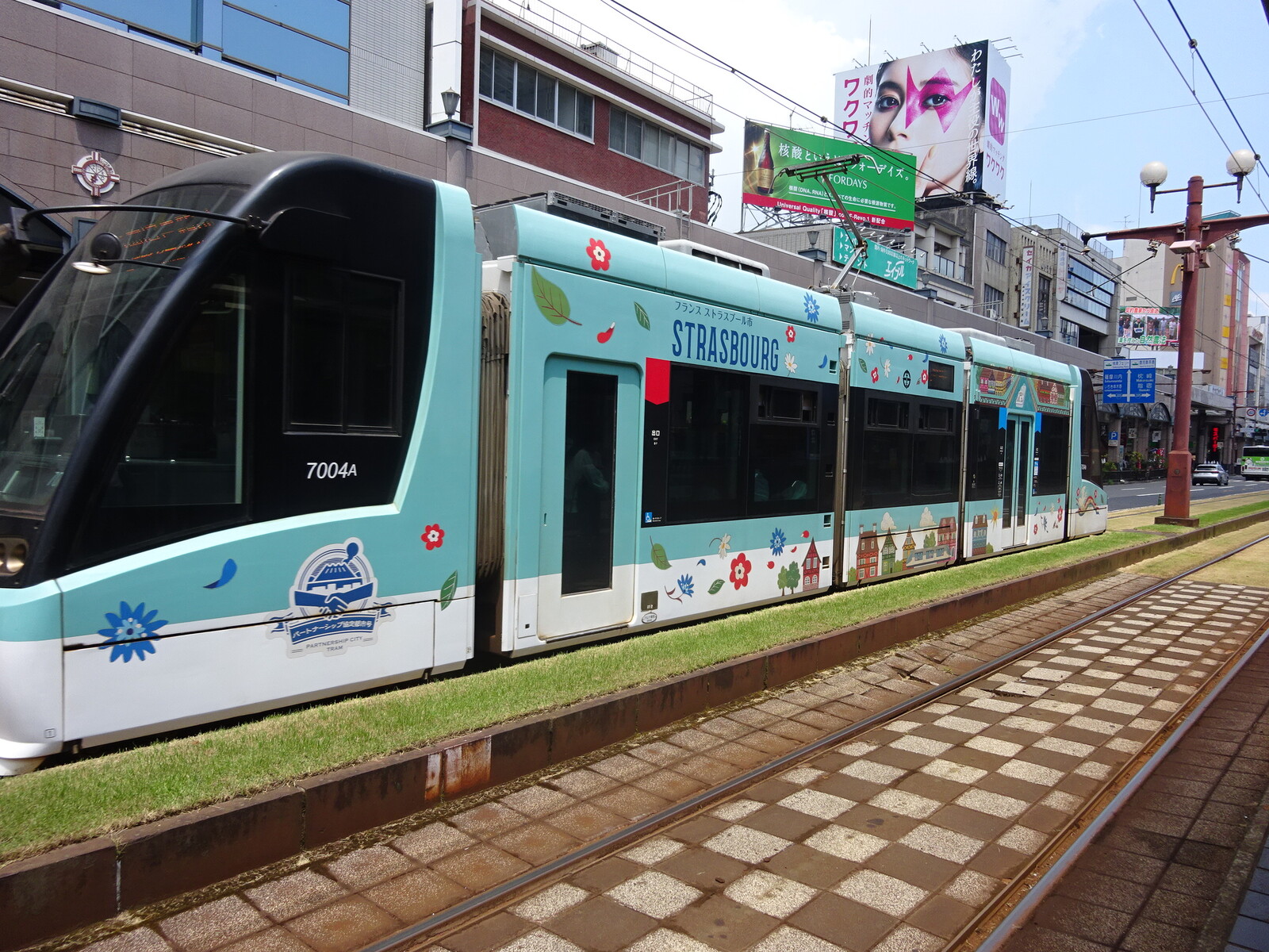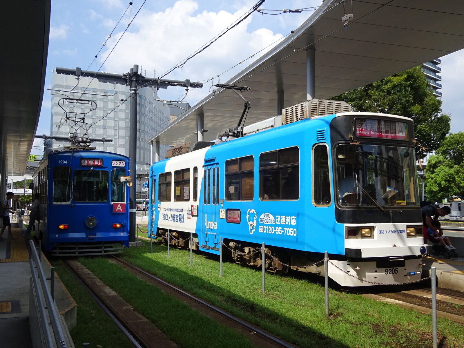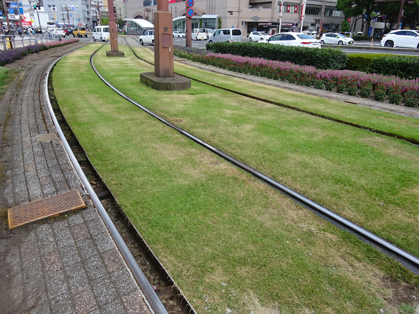 鹿児島の路面電車は、軌道敷に芝が敷かれていたり、架線を軌道敷内のセンターポールにかけていたりして、けっこうアグレッシブに運営している様子が見て取れたよ。