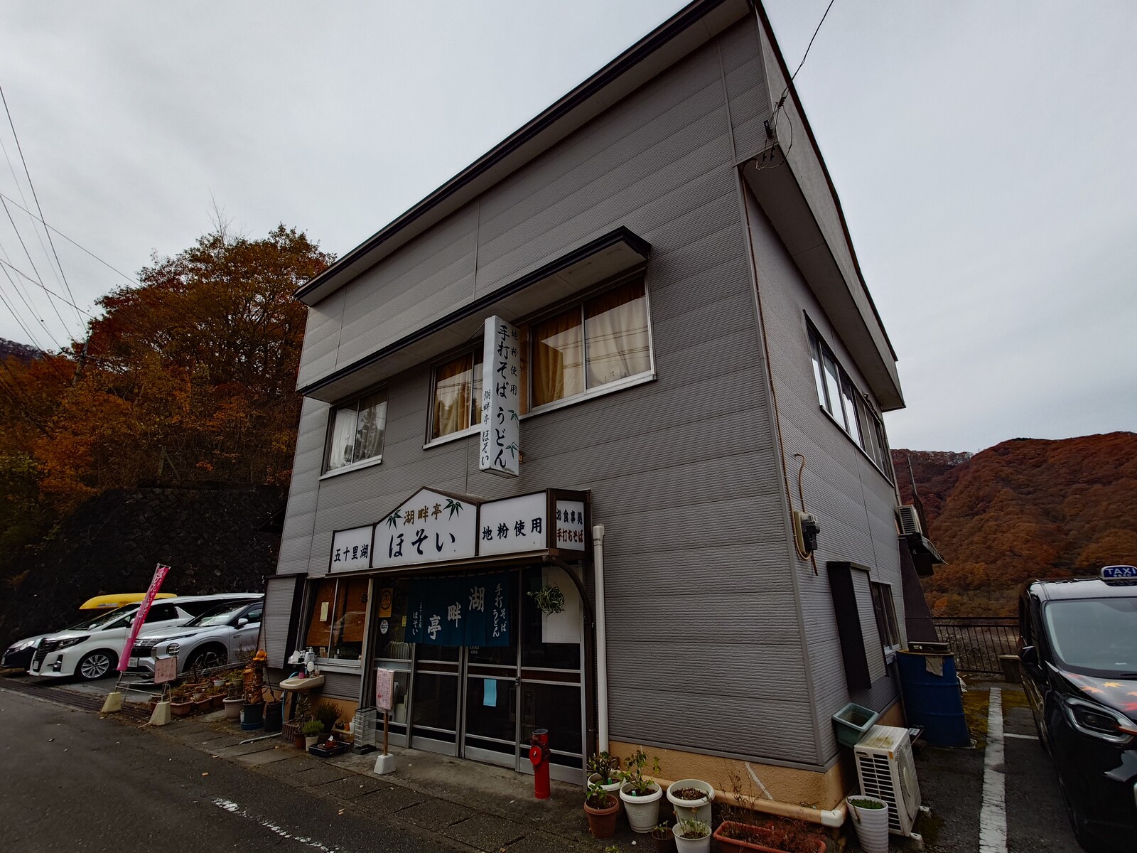 この日、ダム巡り、日帰り温泉巡りをしていたボクは、お昼はやっぱりそばだよね、と思ったのだった。この日入ったのは「湖畔亭ほそい」。