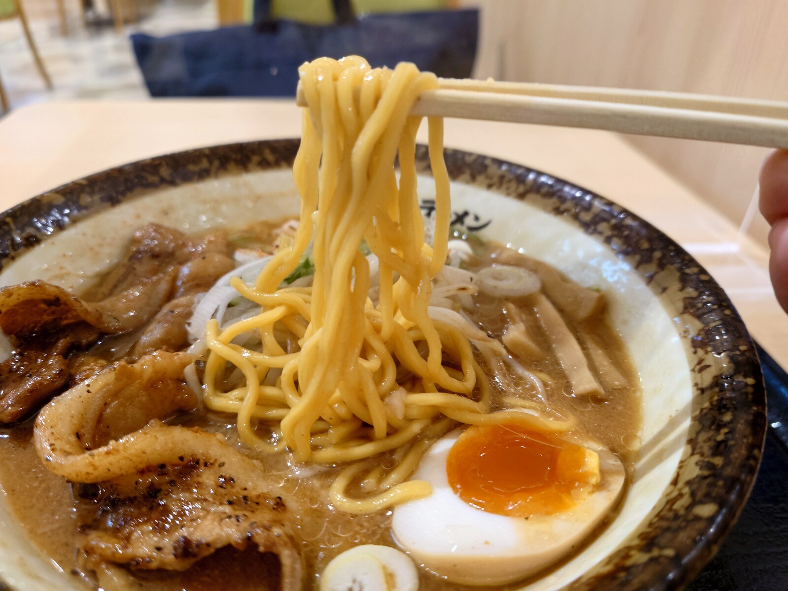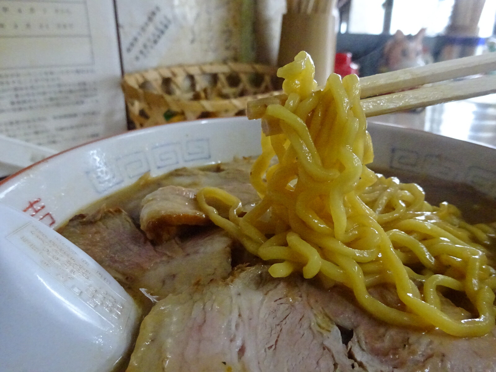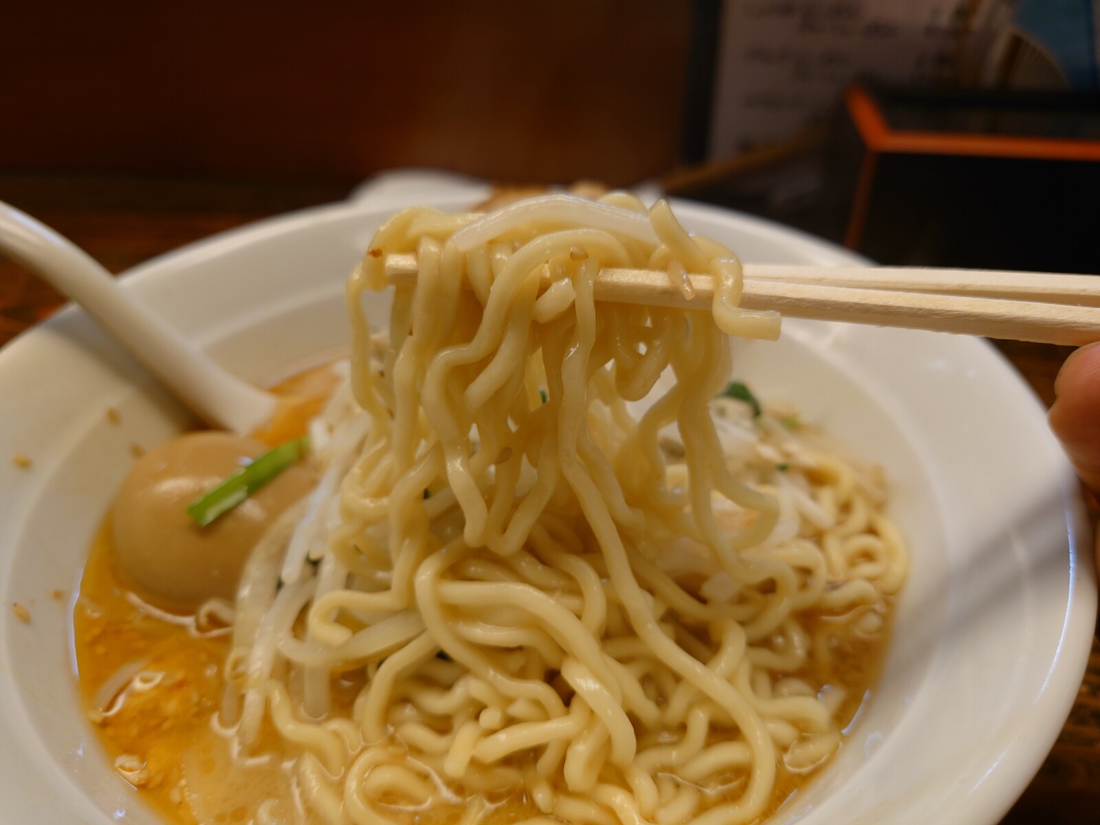 スープは濃い目でしっとりした味噌味。独特なんだけど、個性が立って確立してるんだと思ったよ。だから、人気のほども納得。麺はかなり硬めの仕上げで、かみごたえがあったよ。