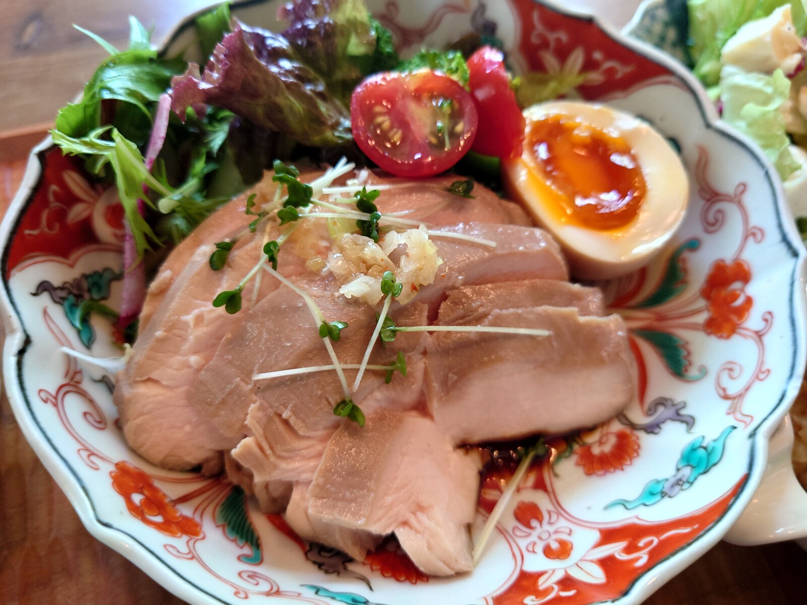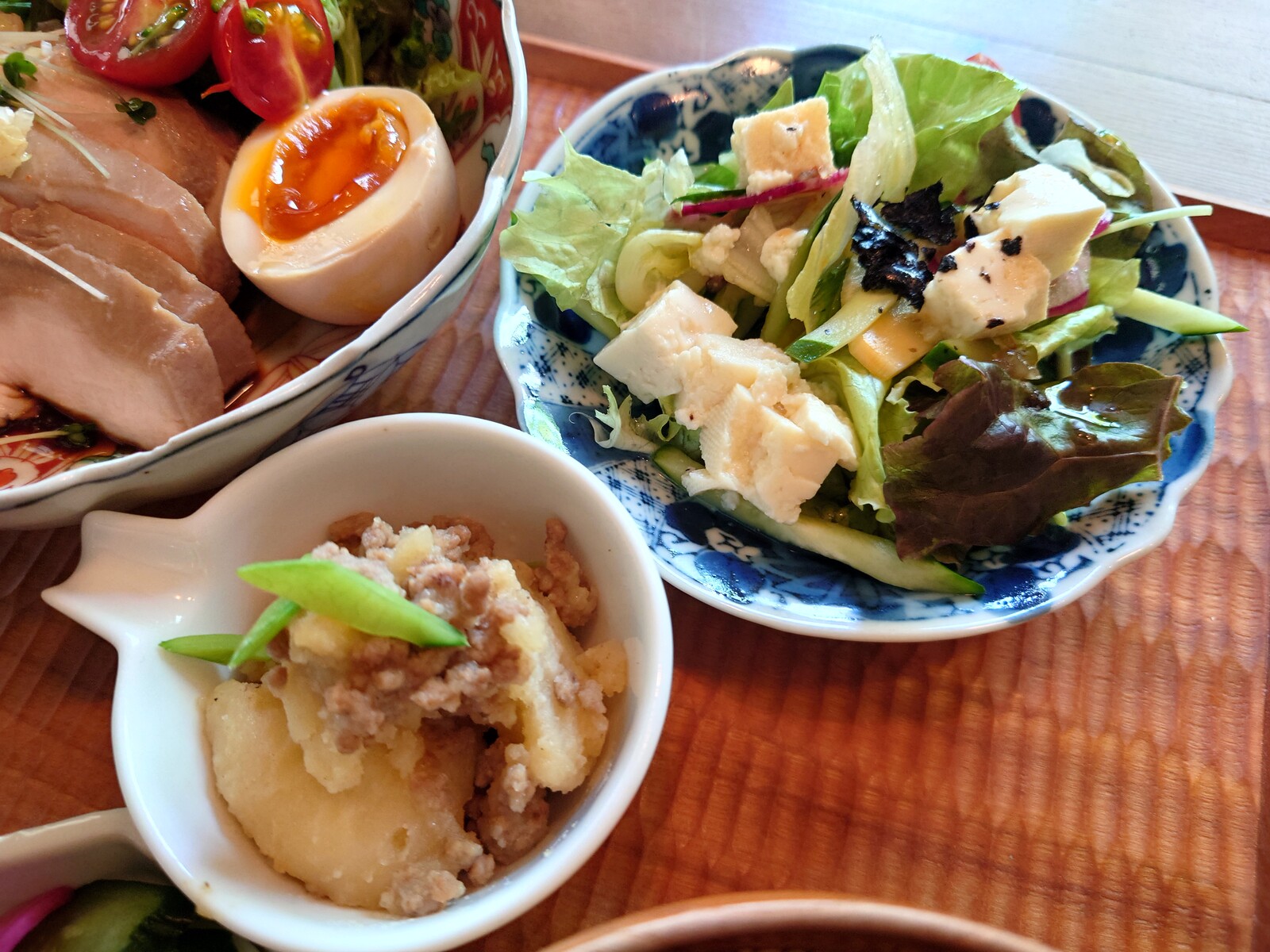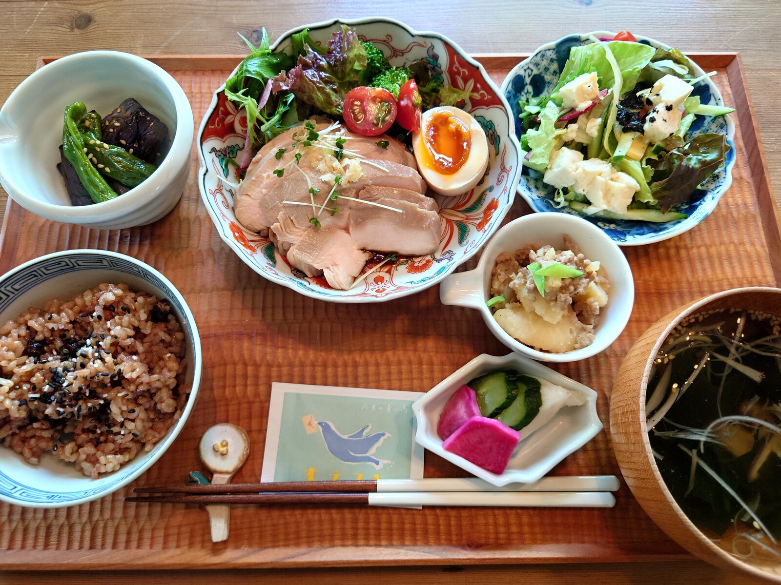 ランチは、3つのセットからチョイス。ボクが選んだのは、『甘酒塩麴唐揚げのみぞれ和え』という魅力的なラインナップがメインの『B lunch』だよ。4つの副菜がついているのもうれしいね。