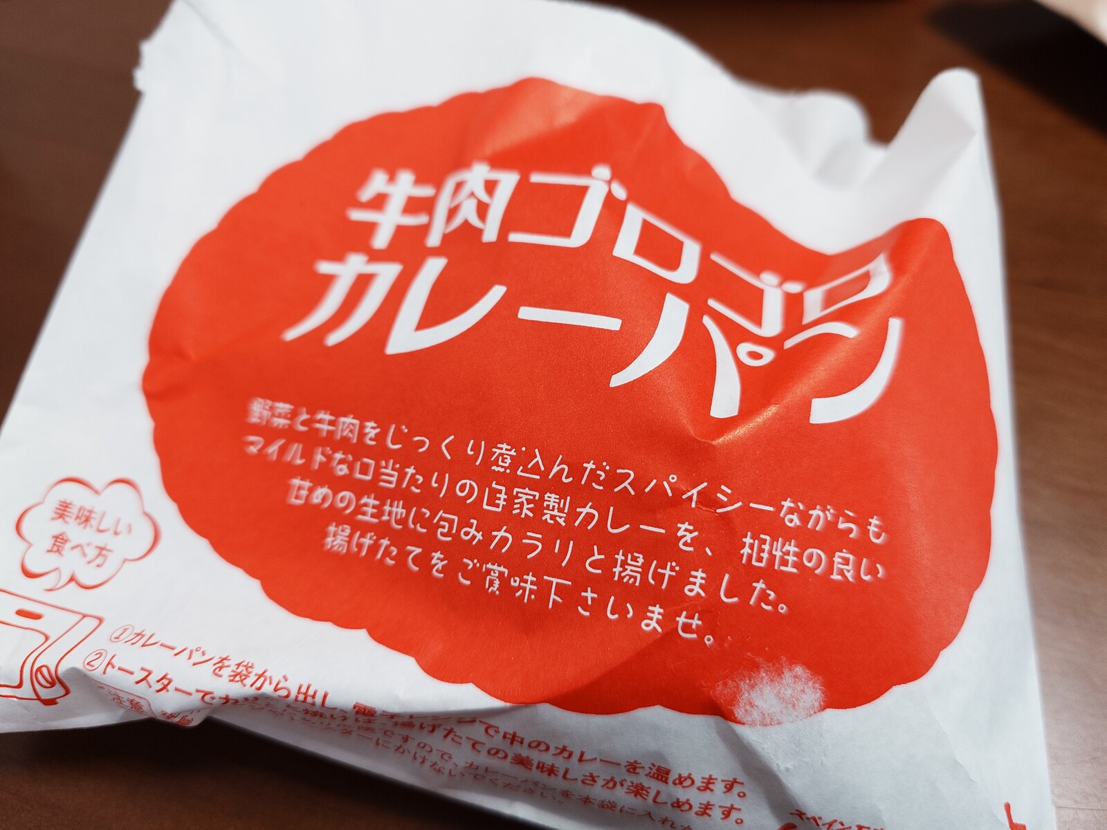 包まれてた袋には、おお、確かに「野菜と牛肉をじっくり煮込んだ」って書いてあるねぇ。揚げたてをご賞味下さいませ、の言葉通りに揚げたてを買ってきたから、家でもまだかなり温かかったよ。その分、お味も一段ステップアップ。