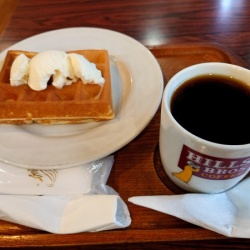 この日は、富山駅前にある老舗の喫茶店「カフェメルカード富山店」の『ワッフル』を味わいに行ってみたよ。コーヒーはアメリカン。←富山のいろいろを知りたい人は、ここを見てね〜。 四角いワッフルが、何とも昔懐かしい感じだね。バターの香り豊かなワッフルに、バニラ ...