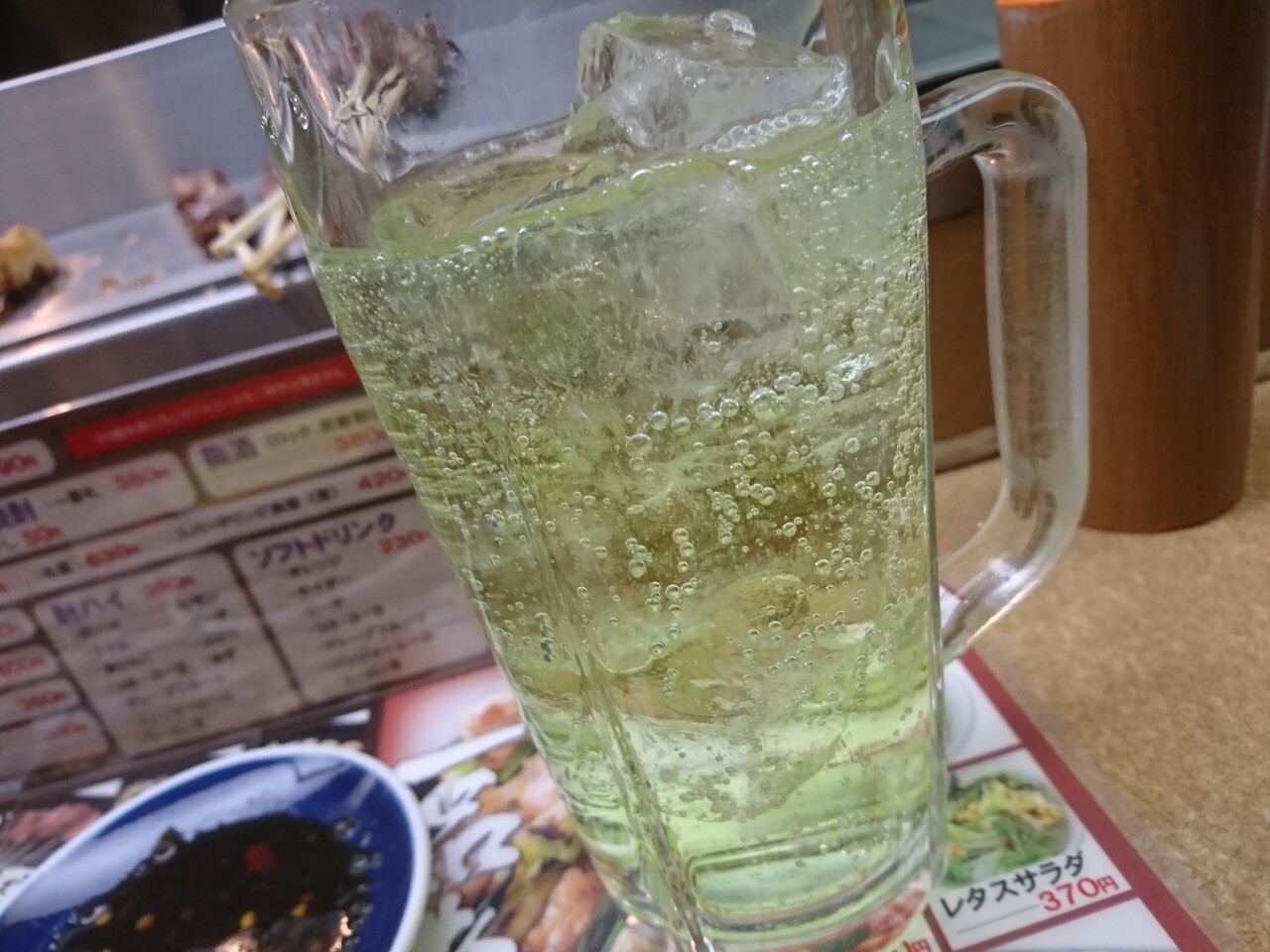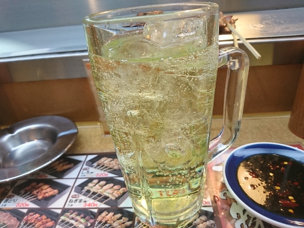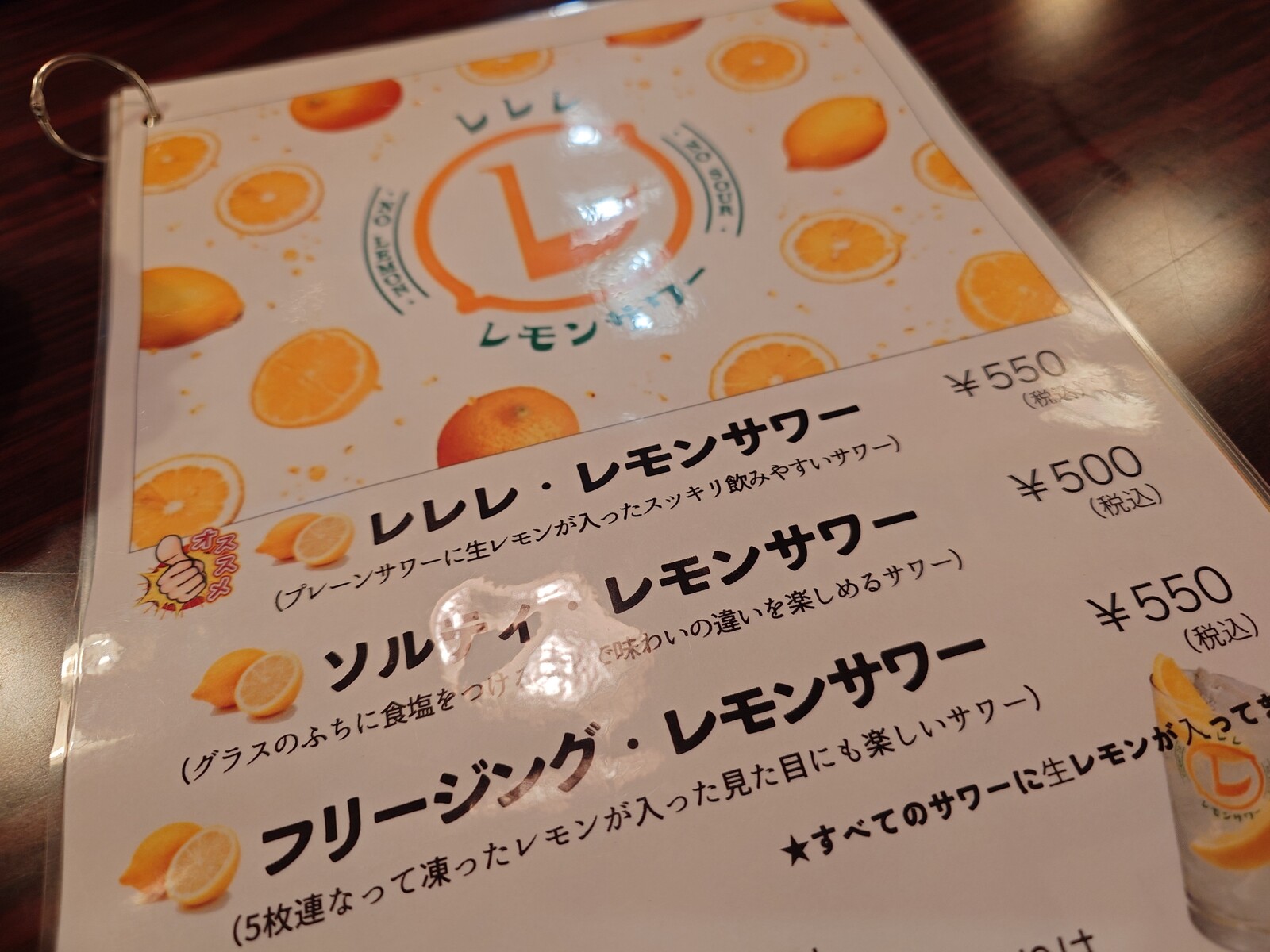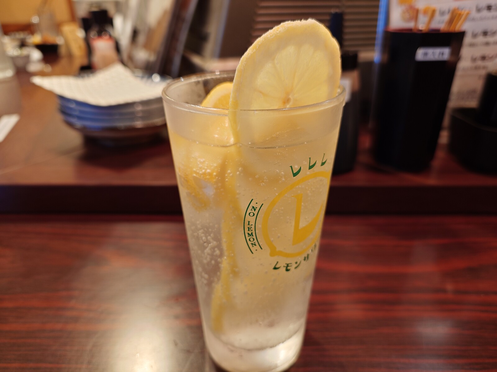 旨い肴に『生ビール』はあっという間に空になり、おかわりに頼んだのが『フリージング・レモンサワー』。凍らせたスライスレモンが5枚入ってて、なかなかのビジュアルではないか。一緒に入ったくし切りレモンを全部絞って、濃い目になったレモンサワーは、今の季節にぴったりの一杯だったよ。