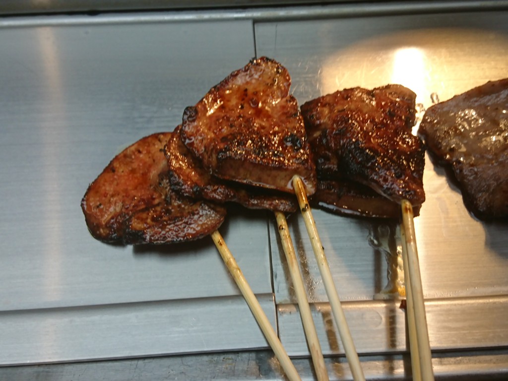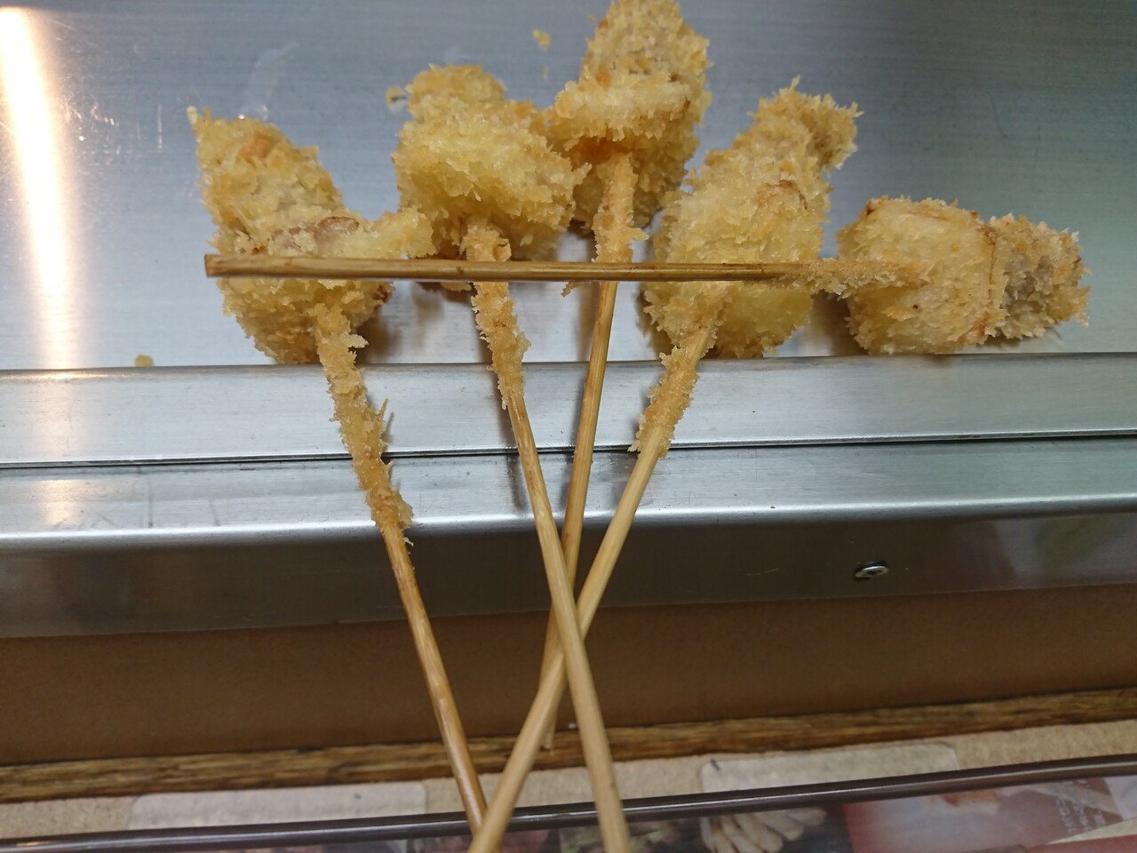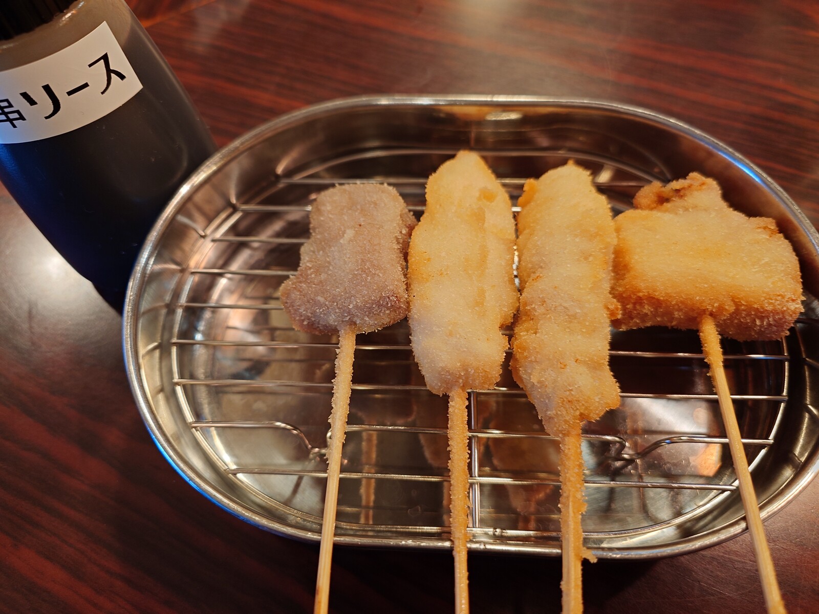 このお店の一押しが串揚げだったから、『お肉4本セット』をたのんでみたよ。牛、若どり、ささみ、豚の4本が、さっくり揚がって登場。衣にはほとんど味がなかったから、素材の味を楽しむことができる串だったんだ。