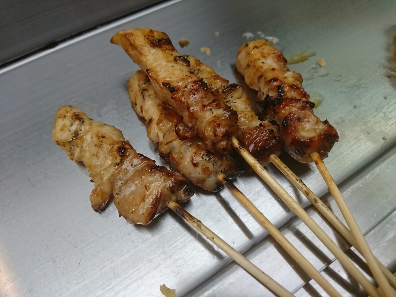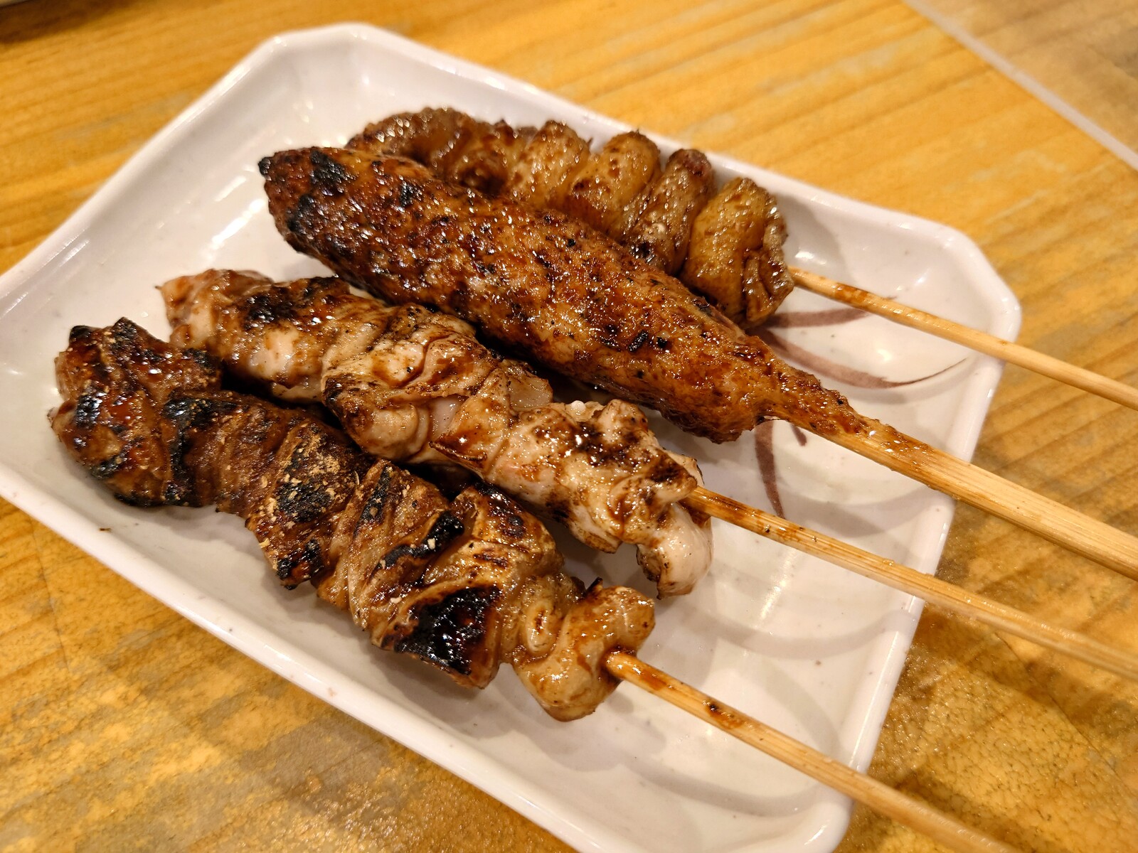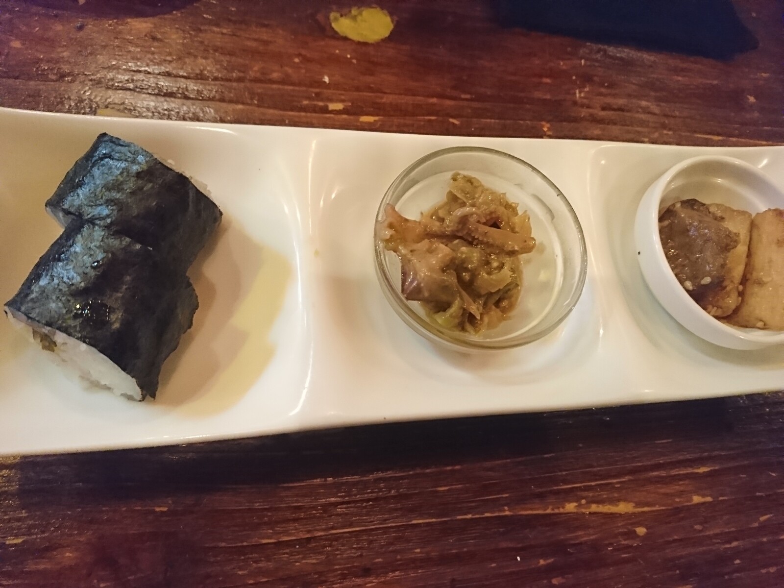 。このお店の一押しが串揚げだったから、『お肉4本セット』をたのんでみたよ。牛、若どり、ささみ、豚の4本が、さっくり揚がって登場。衣にはほとんど味がなかったから、素材の味を楽しむことができる串だったんだ。