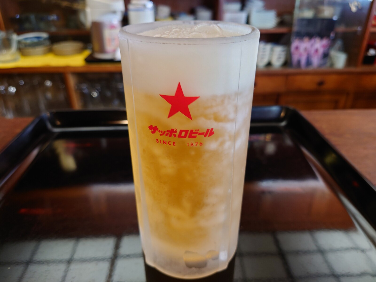 。まずは、サッポロの生をいただこうではないか。ジョッキがガンガンに凍らせてあるから、ビールもちょっぴり凍ってじゃりじゃりになるのがいい感じ。