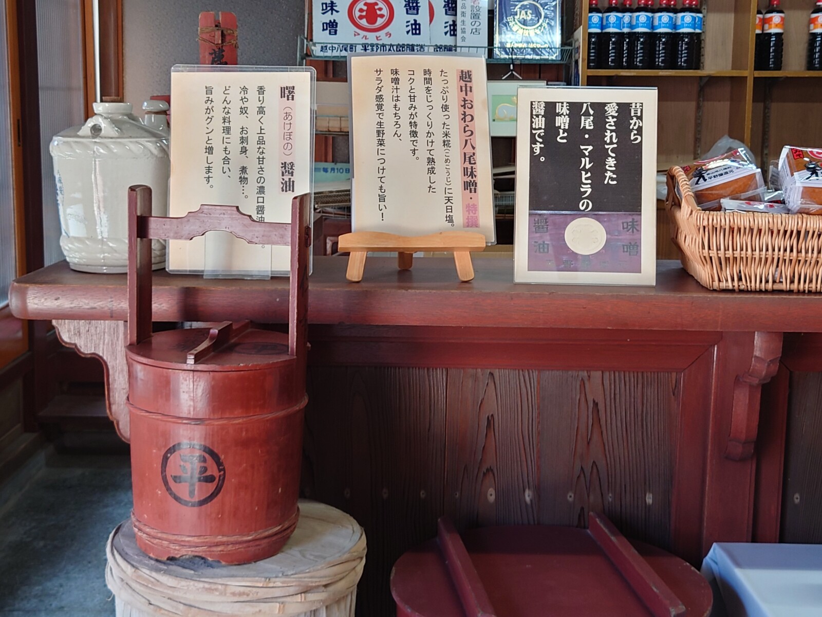 この日、八尾の街中を歩いていて、ふと目についたのが、八尾の地醤油屋さん「平野醤油味噌醸造元」。ふらふらと吸い寄せられるように入ってみたんだ。この店では、味噌と醤油をつくっているんだね。