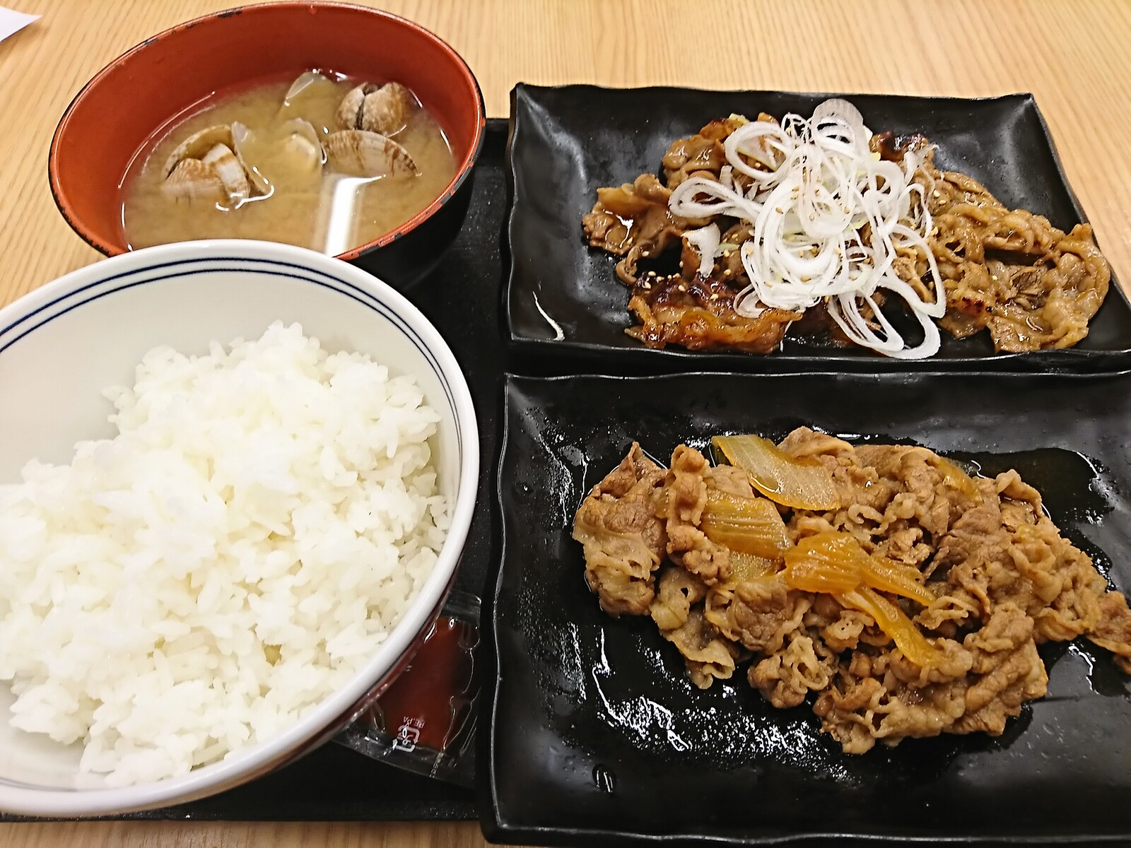 「すき家」って、今は、朝食のメニューが実に多彩なんだね。この日ボクが選んだのは『牛小鉢ベーコンエッグ定食』。一品を添えることができたから『ソーセージ』もチョイスしたよ。登場したのがこちら。こうしてみると意外と豪華に見えるよなぁ。海苔に、小鉢までついている〜。