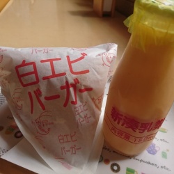 道の駅カモンパーク新湊の白えびバーガーを新湊乳業のフルーツ牛乳と一緒に