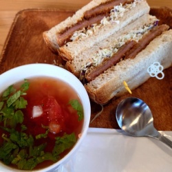 あまはらし食堂のハムカツサンドとともに海を眺める